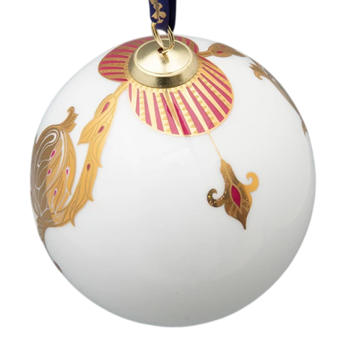 Украшение новогодней ели – одна из самых приятных традиций, которая превращается в настоящее творчество. Особенным украшением новогодней ели станет шар из серии «Рождественские узоры». Замысловатый декор на новогоднем шаре напоминают настоящие морозные рисунки на стекле, а расцветка – напротив, фантазийная. Автор использует насыщенный оттенок красного – один из цветов, которые ассоциируются с Новым годом и дарит ощущение праздника. Такой фарфоровый шар изготавливается вручную, что требует максимальной бережности, внимательности и аккуратности.