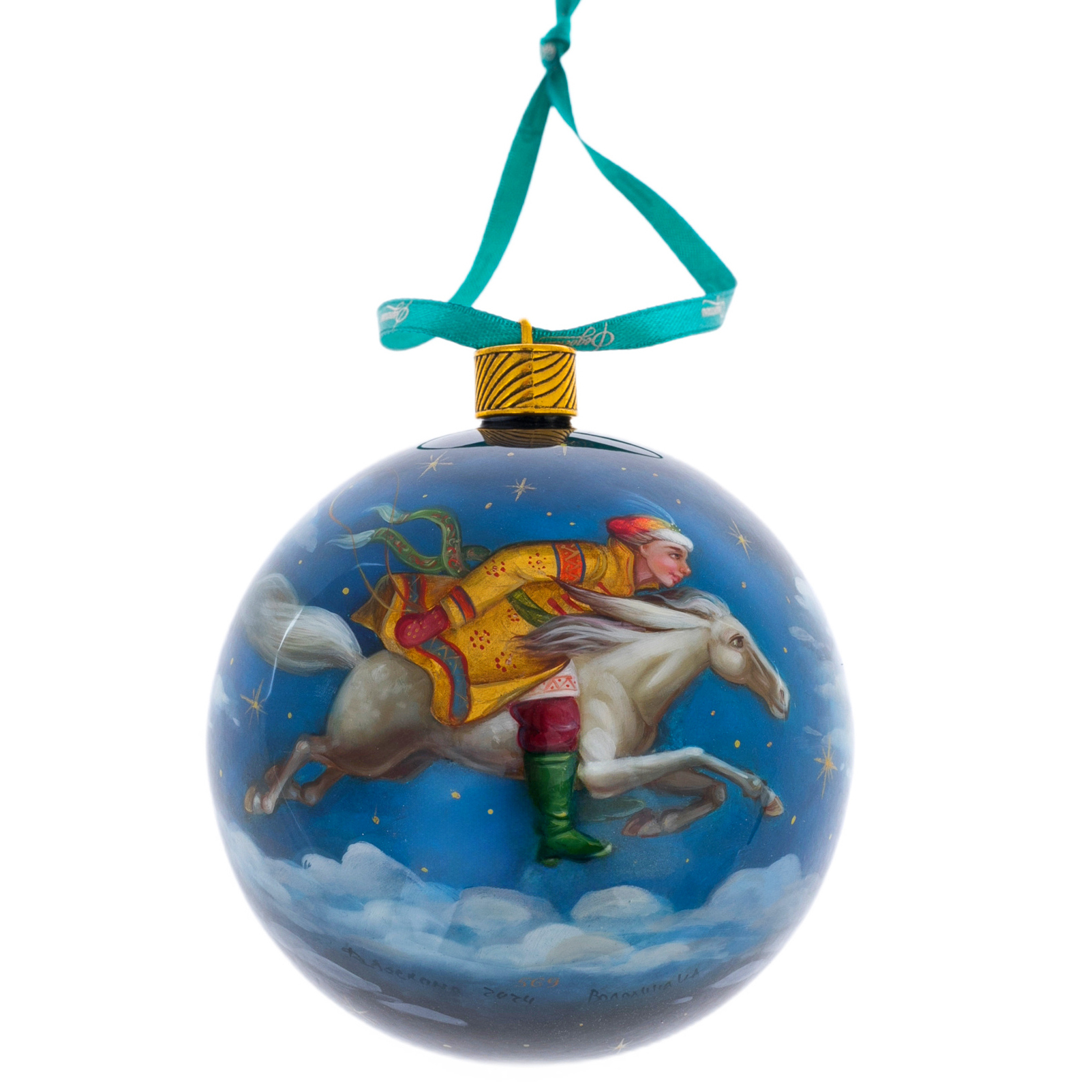 Шар елочный "Конёк-Горбунок" из Федоскино — это воплощение волшебства и русского фольклора, замершего в границах совершенной формы. Каждое прикосновение кисти художника бережно переносит легенду на гладкую поверхность изящного папье-маше, превращая её в многослойную картину, в которой оживают сказочные образы. Конёк-Горбунок, устремлённый в небесную высь, символизирует неукротимое стремление к мечте, смелость и магическую силу, способную преодолеть любые преграды. Легендарный скакун несёт своего наездника сквозь звездное небо, разрезая небесный простор, где каждый отблеск золота и серебра искрится в лучах воображаемого света.