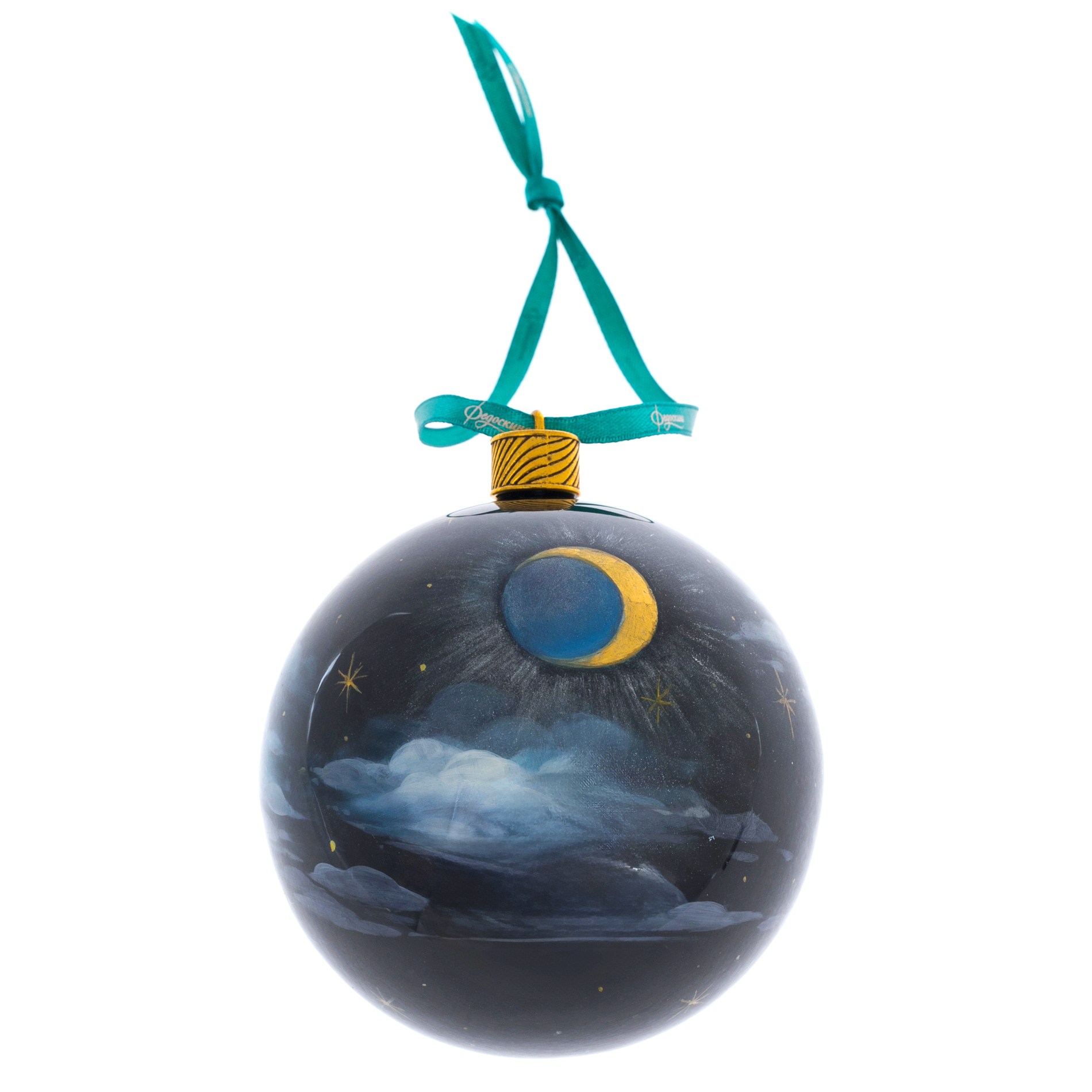 На другой стороне шара тёмное, почти бархатное ночное небо усеяно сверкающими звёздами. Сияющий месяц — страж тишины и вечного покоя — наблюдает за путешествием героя, создавая атмосферу тайны и вечной гармонии. Художник использует тончайшие мазки и технику многослойной живописи, характерную для знаменитого федоскинского промысла. Тёмные фоны, глубина цвета и едва заметное мерцание, как дыхание самой Вселенной, создают неповторимое ощущение объема и живости.
