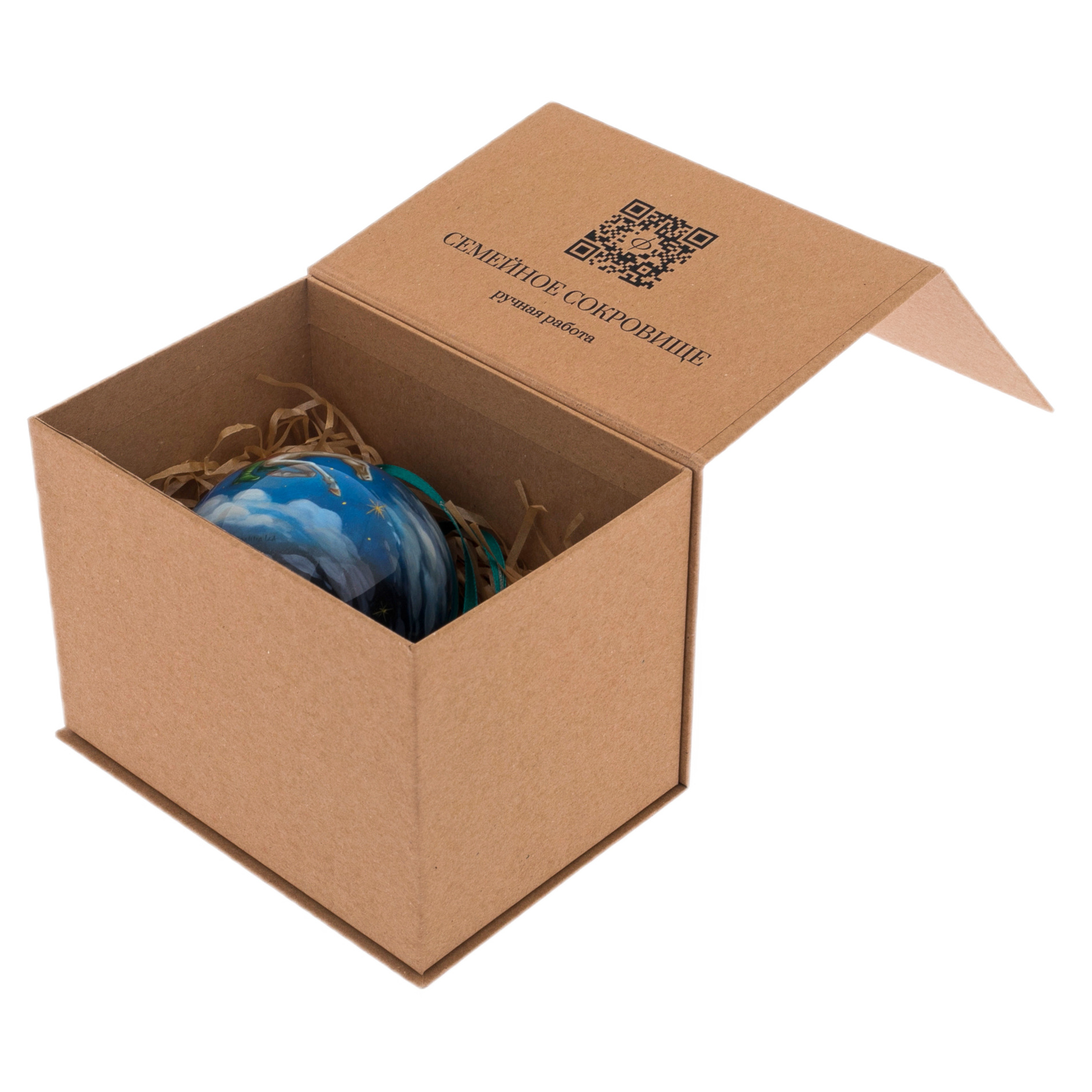 Шар аккуратно упакован в крафтовую коробку — это не просто упаковка, а обрамление для произведения искусства, достойного украшать самые изысканные интерьеры. "Конёк-Горбунок" из Федоскино — это не просто ёлочная игрушка, а символ мечты, силы и веры в чудеса, приносящий в дом атмосферу сказки и роскоши.