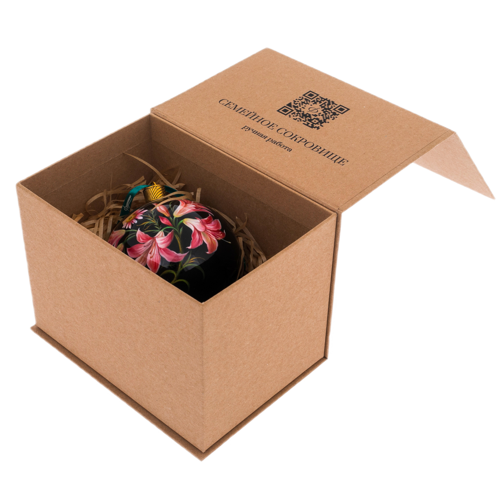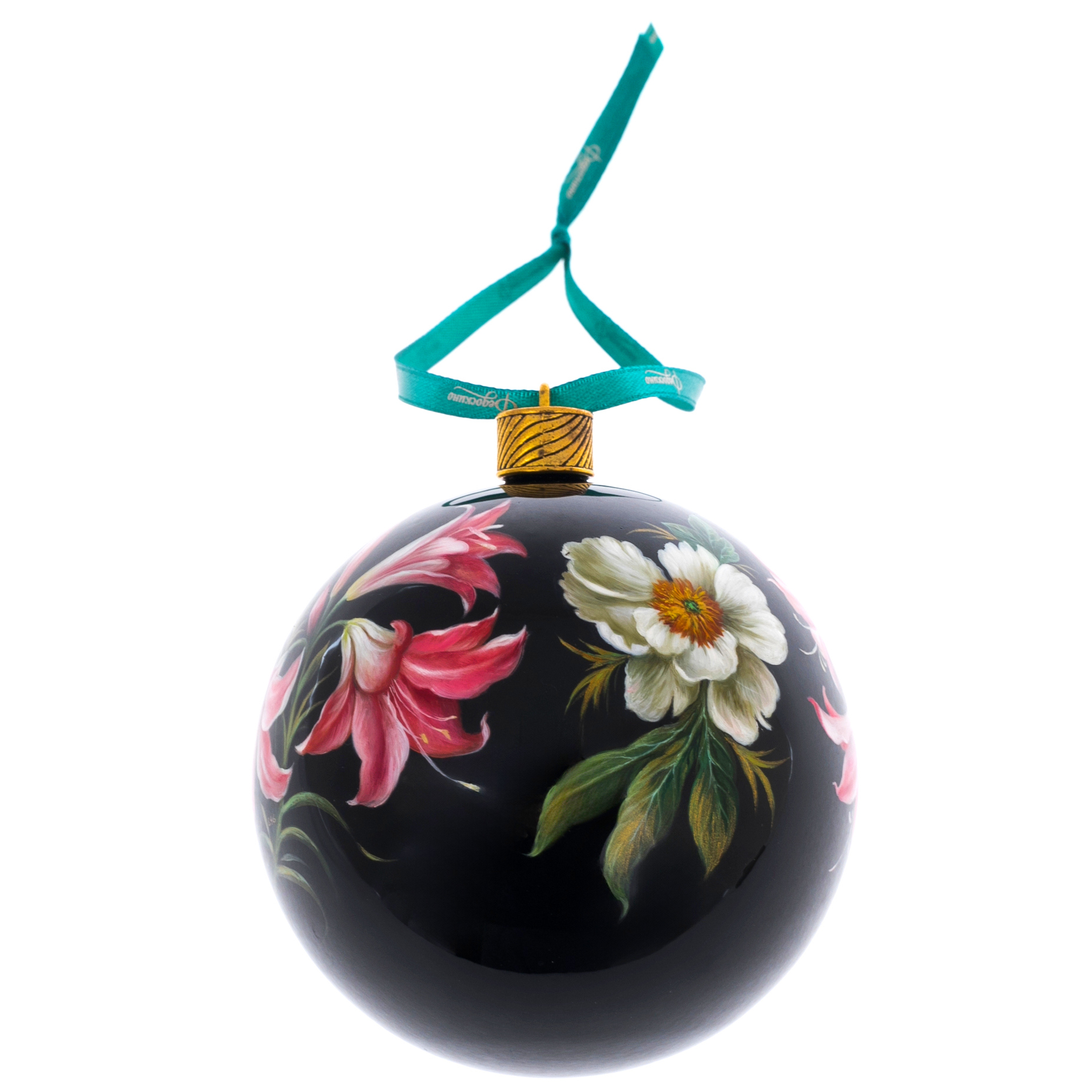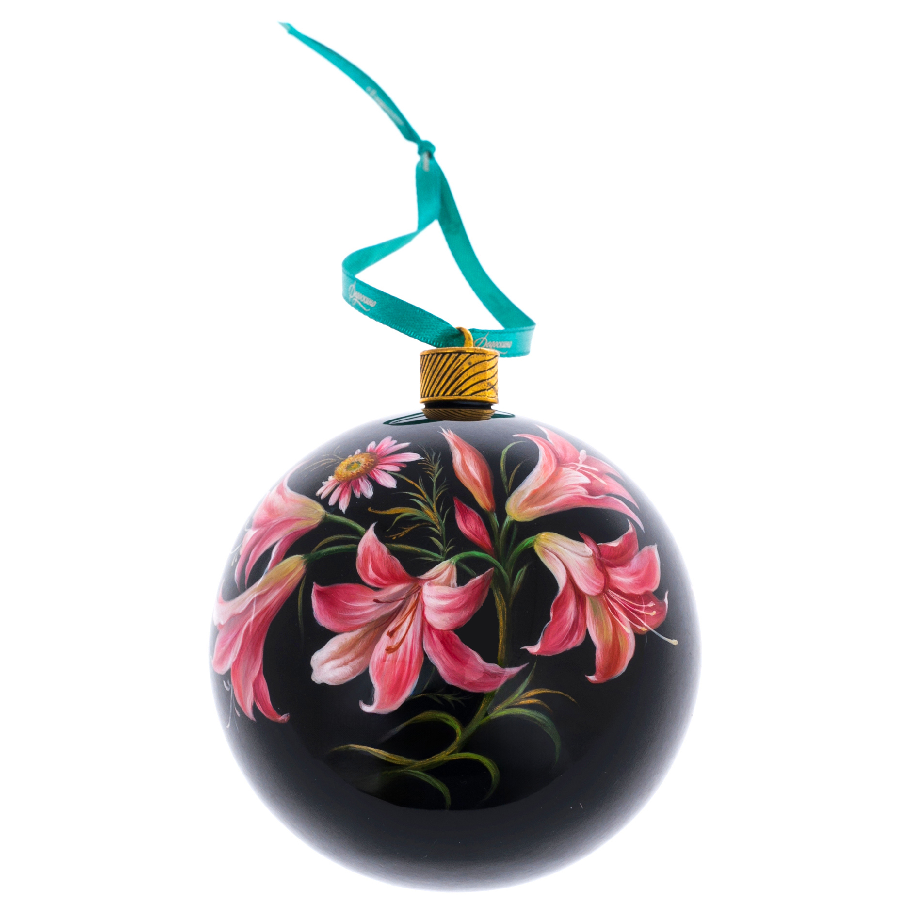 Федоскинская техника миниатюрной живописи прославилась благодаря особому вниманию к деталям и многослойности рисунка. Полупрозрачные краски, накладывающиеся одна на другую, создают эффект глубины и реалистичности, подобно драгоценному витражу. Цветочные мотивы на этом шаре — не просто символ праздника, но и дань красоте природы, ее вечному циклу возрождения и совершенства. Белоснежный цветок, как аллегория чистоты, возвышается на контрасте с густым черным фоном, а багряные лилии наполняют композицию теплом, страстью и гармонией.