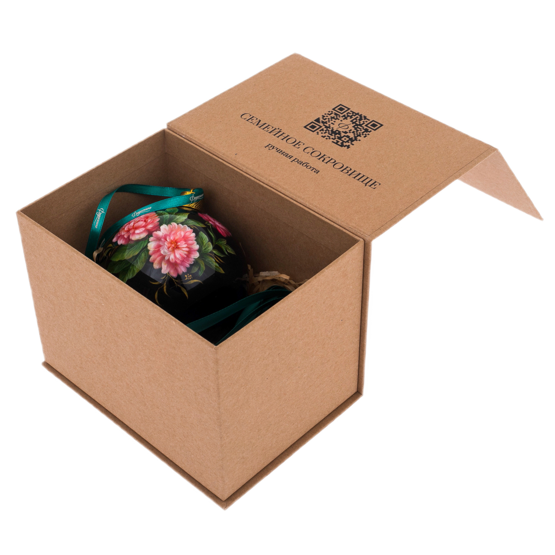 Великолепие, рожденное в вечности — таков образ "Пиона", воплощенного на новогоднем шаре из папье-маше, созданного в знаменитой технике Федоскинской миниатюры. Здесь время замирает, а цветы, написанные кистью мастера, расцветают на тёмном атласном фоне. Пышные бутоны пионов — символ благополучия и аристократического величия — переливаются нежнейшими оттенками алого, розового и кремового. Каждая складка лепестка — словно дыхание лета, заключенное в вечности, а насыщенная зелень листьев обрамляет цветочную композицию, как драгоценный изумруд оправляет рубин и жемчуг.