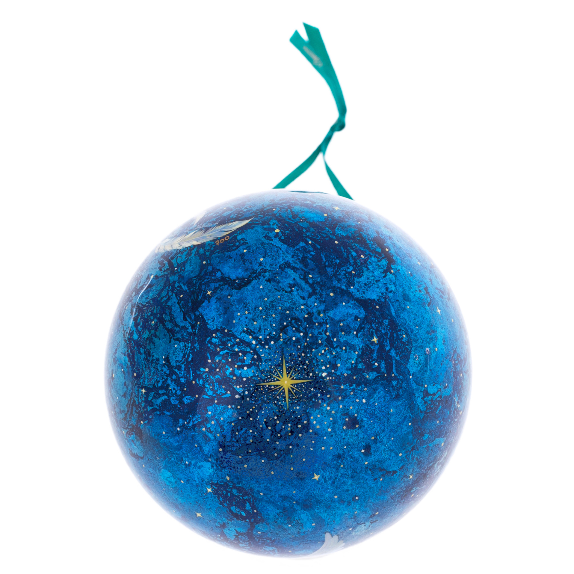 Изумрудная лента, аккуратно завязанная на золотистом держателе, завершает композицию, как точка в совершеннейшем стихотворении. Шар упакован в элегантную коробку, превращая его в драгоценный дар — символ уважения, влияния и глубокого смысла.