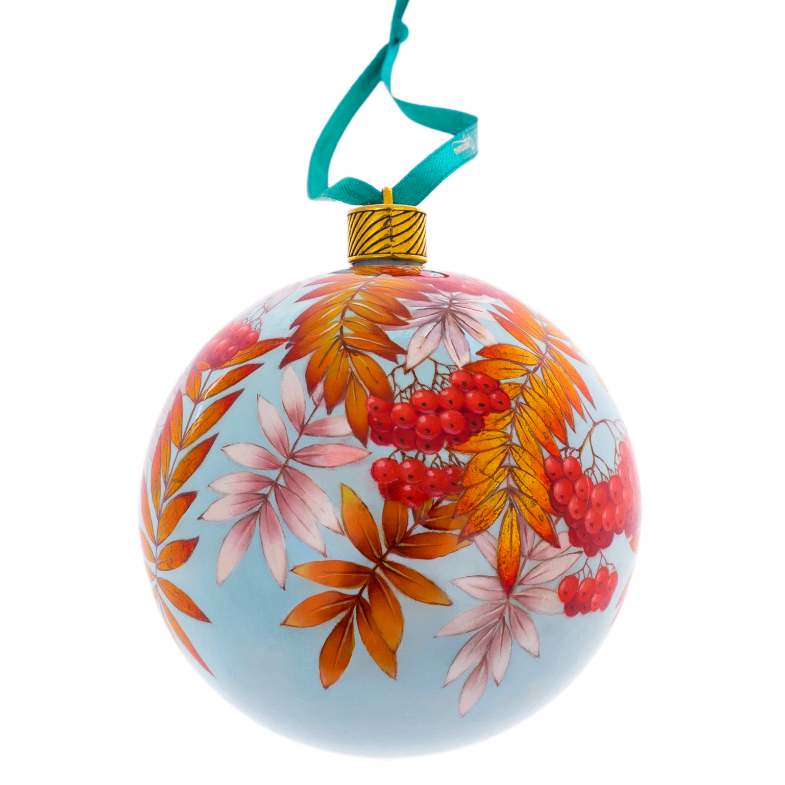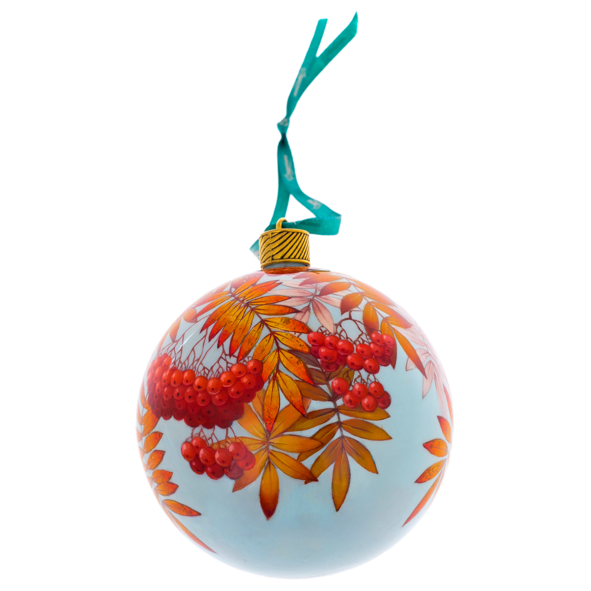 Рябиновые гроздья на фоне небесно-голубого холста рождают живописный аккорд в елочном шаре, словно хранящем дыхание осени. Плоды, рубиновым светом переплетенные с золотистыми листьями, мерцают среди тончайших мазков, как лучистые камни, оправленные в рамку из хрустального инея. Этот сказочный орнамент — не просто украшение, а воспоминание о рябиновых рощах, где время останавливается, а природа рассыпает свои последние сокровища.