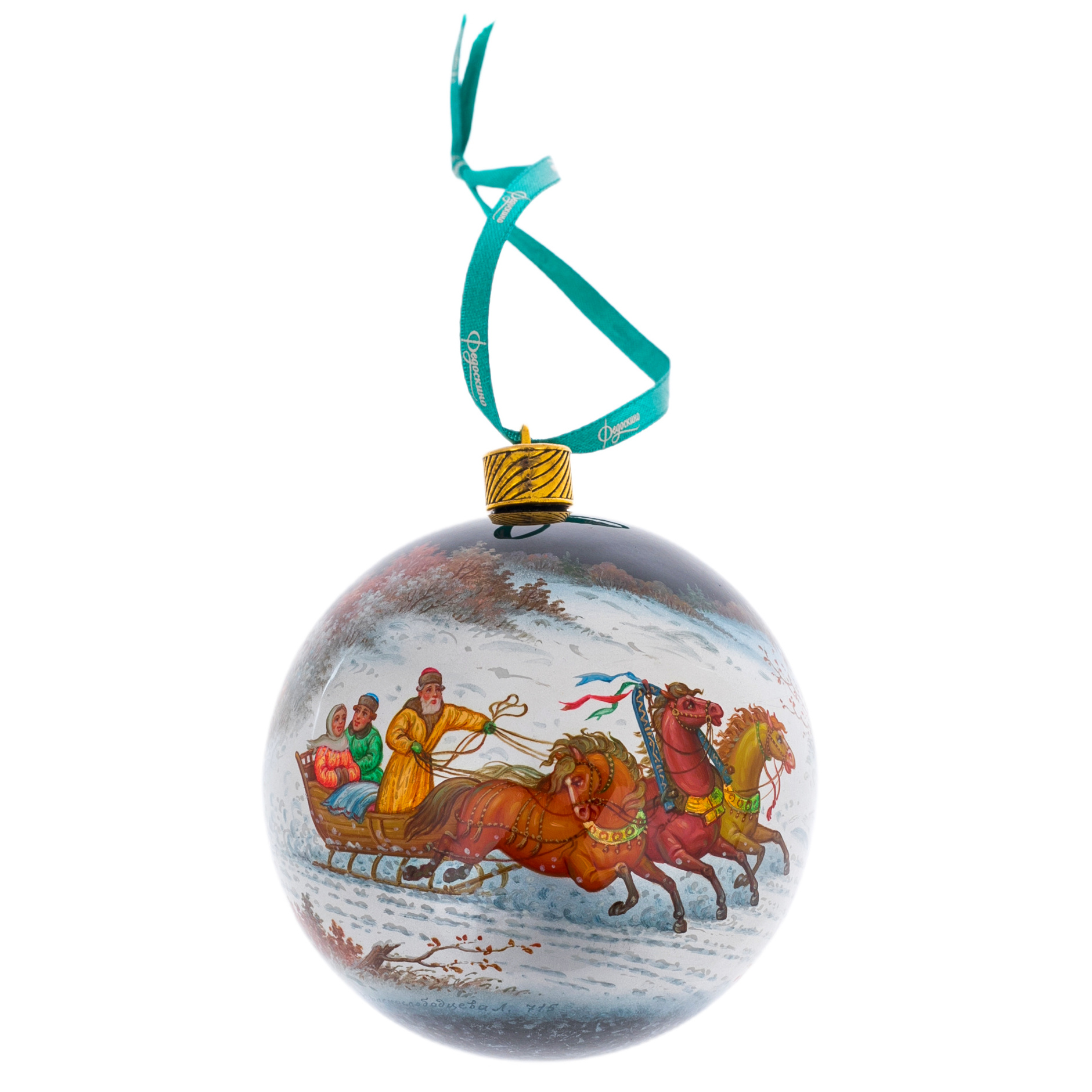 Сквозь морозные узоры на стекле, среди застывших снежных вихрей и шороха еловых ветвей раскрывается мир, сотворённый тончайшими мазками древнего искусства — это ёлочный шар "Тройка" из Федоскино. В его хрупком совершенстве — бесконечность русской зимы и стремительный полёт времени, воплощённый в миниатюрном шедевре.