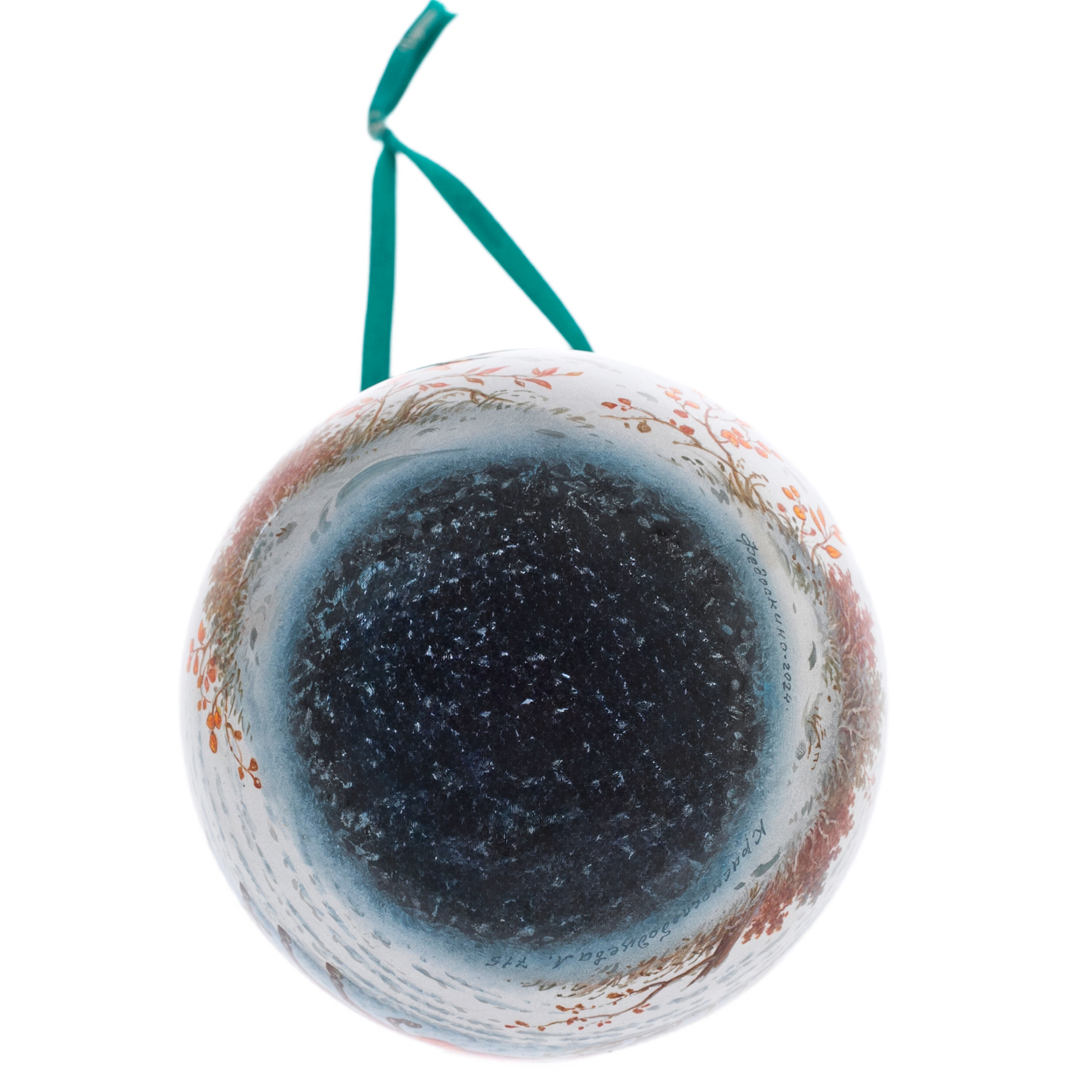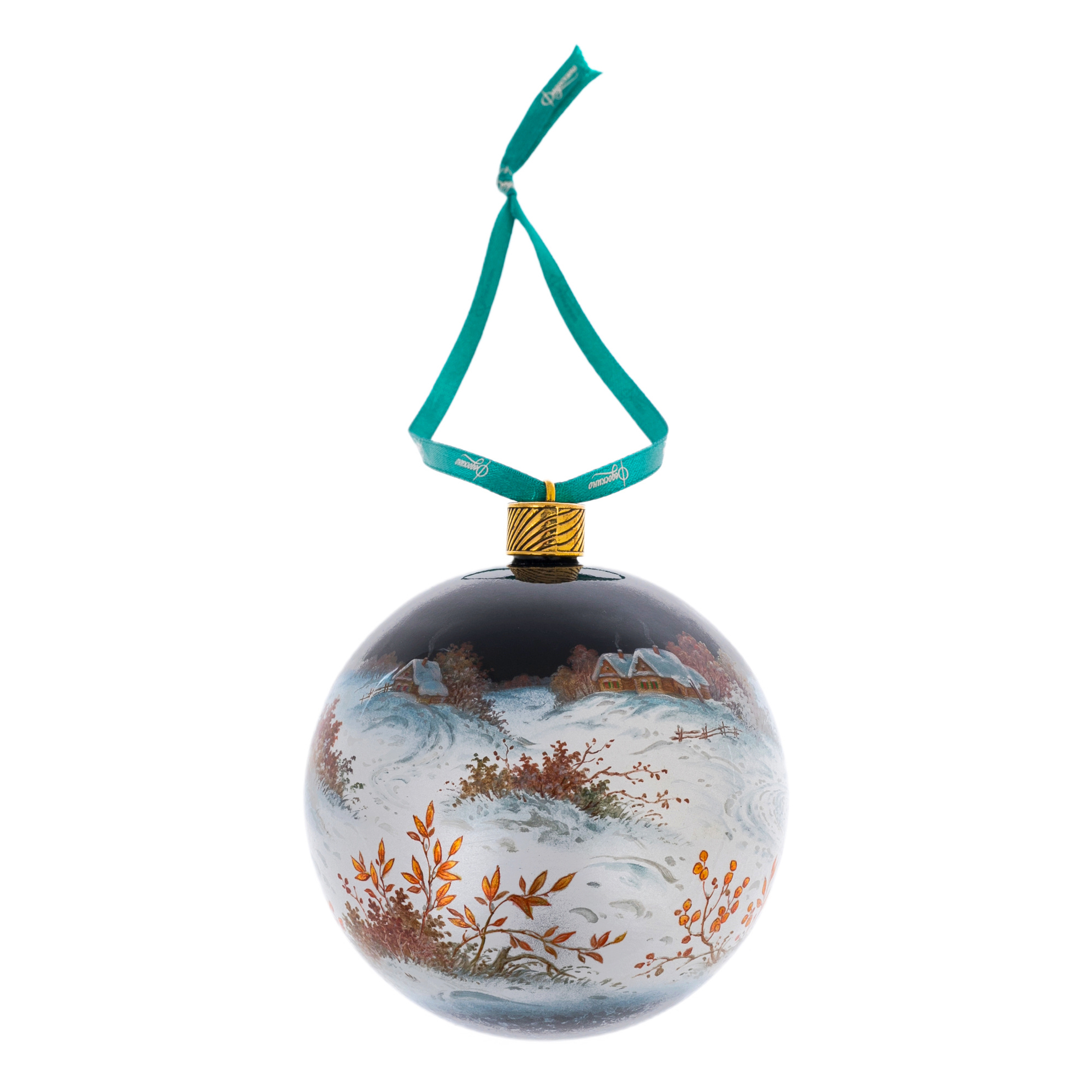 Каждая деталь шара выполнена вручную: снежные сугробы дышат прохладой, золотистые листья оживают, обрамляя картину светлым светом заката. Шелковая лента — изумрудный акцент, подчеркивающий богатство композиции, завершает произведение сдержанной торжественностью.