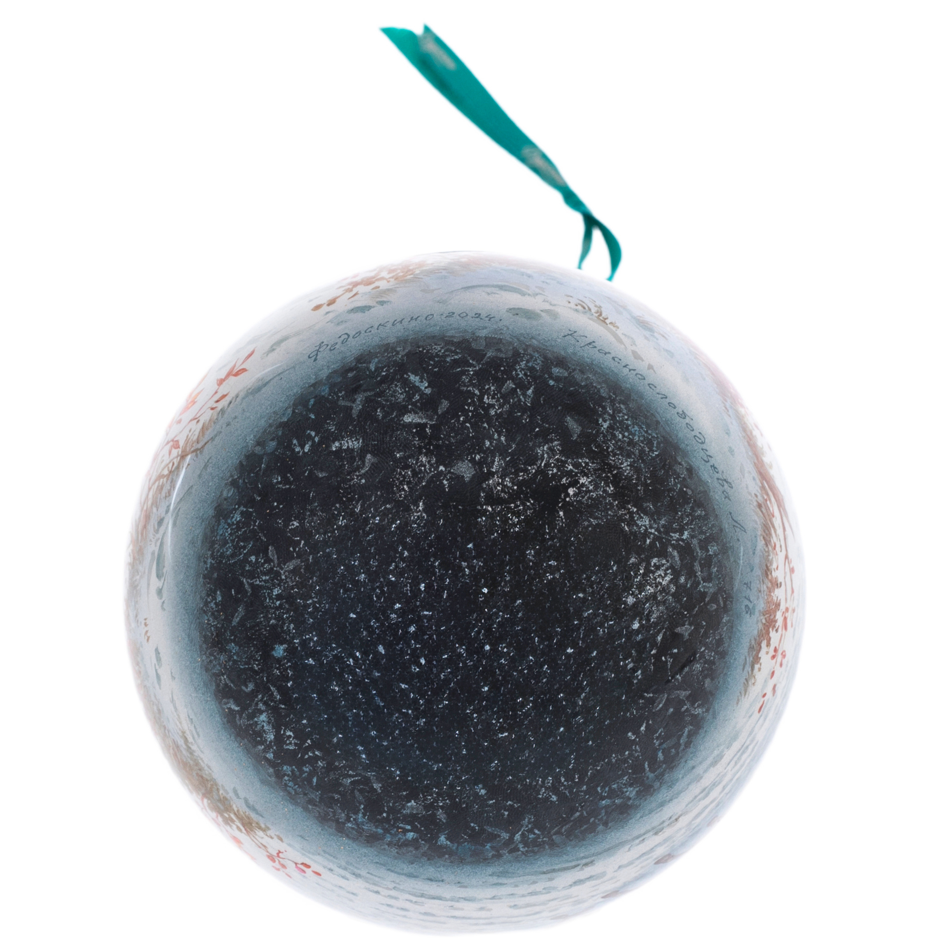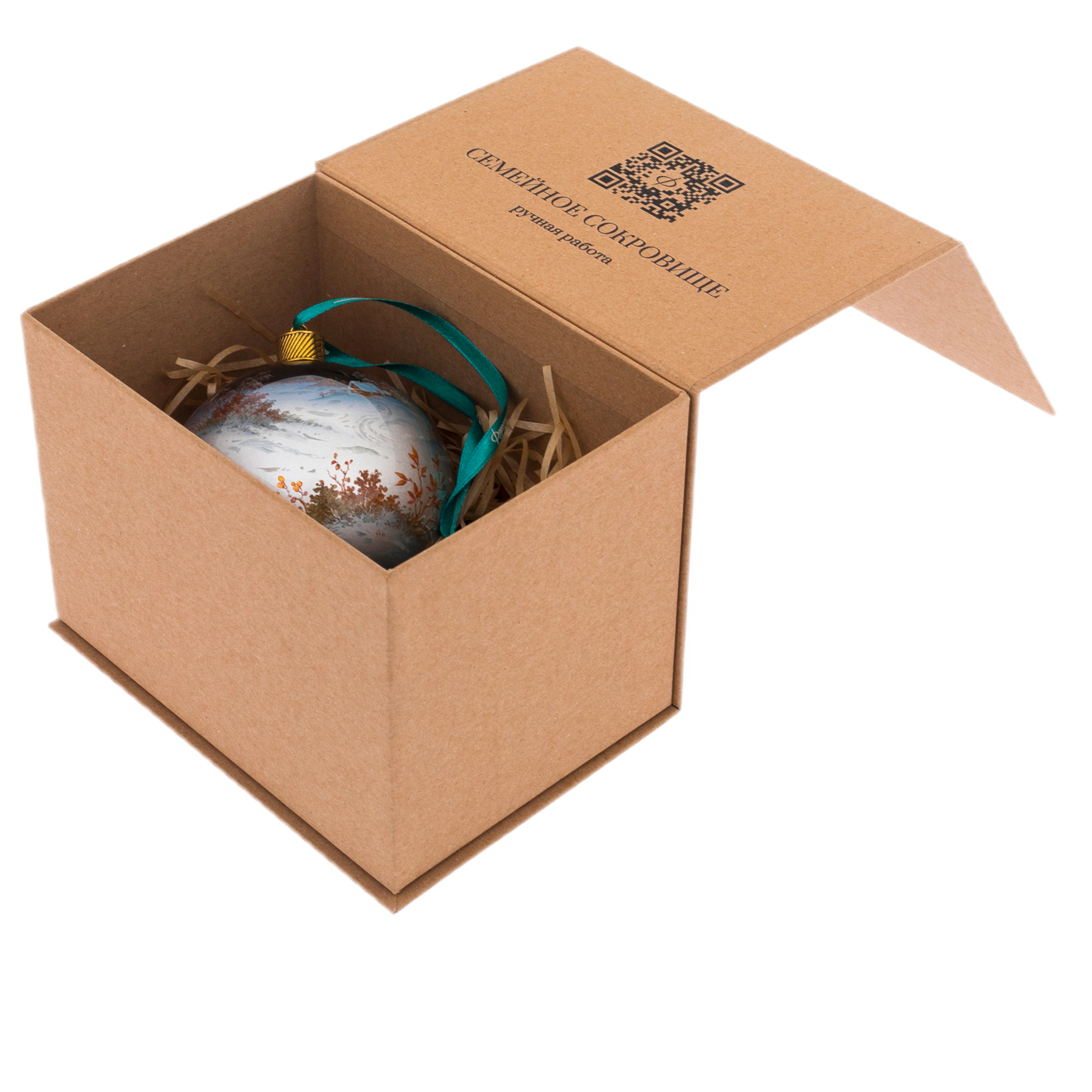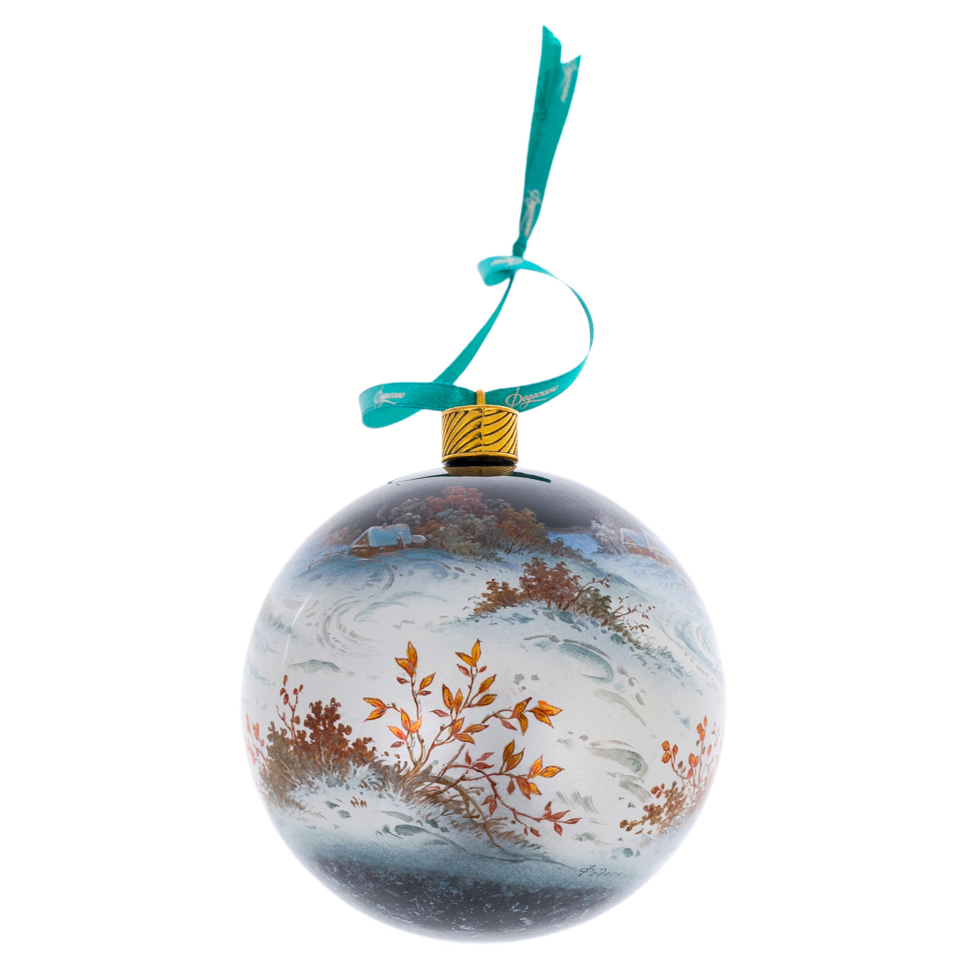 Каждая деталь шара выполнена вручную: снежные сугробы дышат прохладой, золотистые листья оживают, обрамляя картину светлым светом заката. Шелковая лента — изумрудный акцент, подчеркивающий богатство композиции, завершает произведение сдержанной торжественностью.