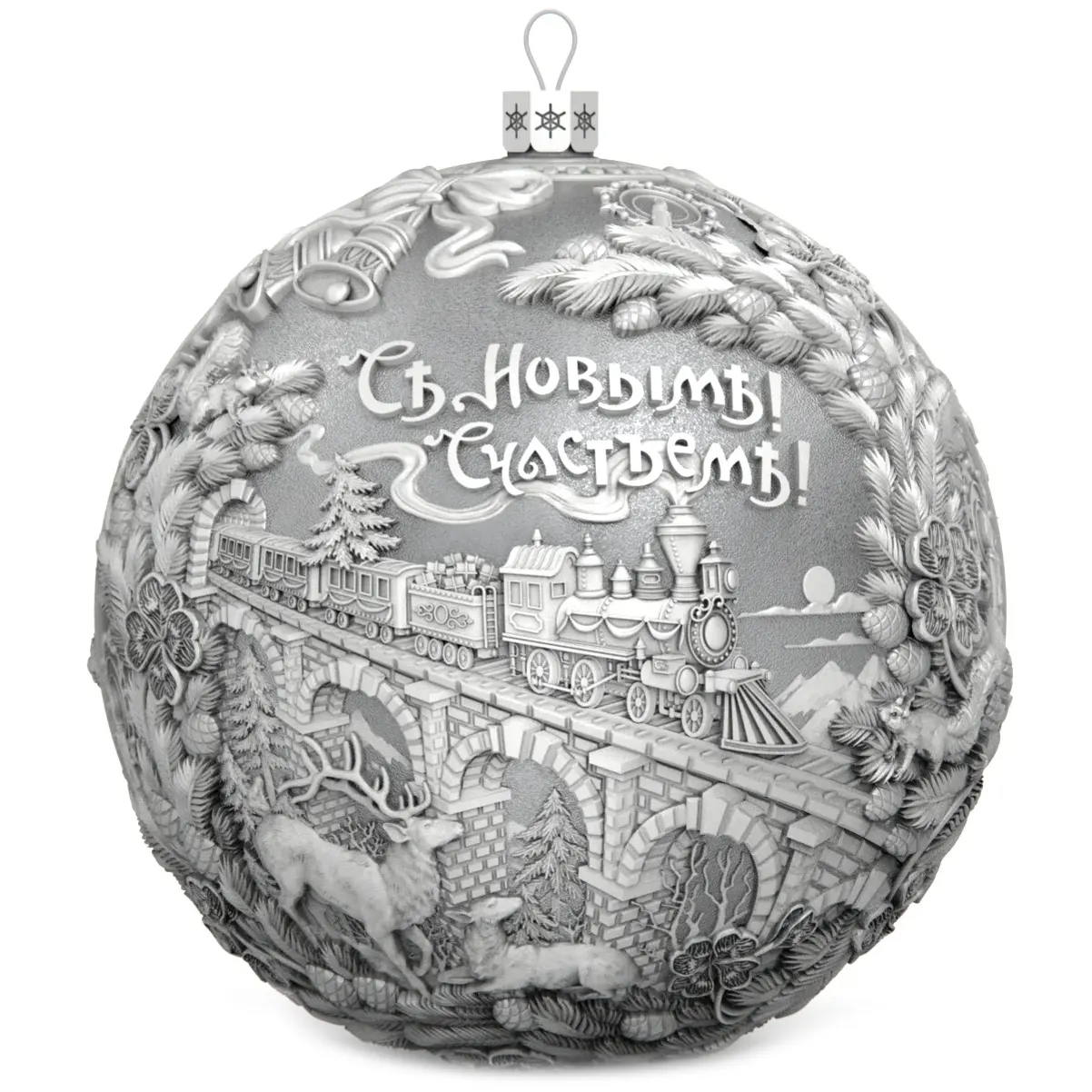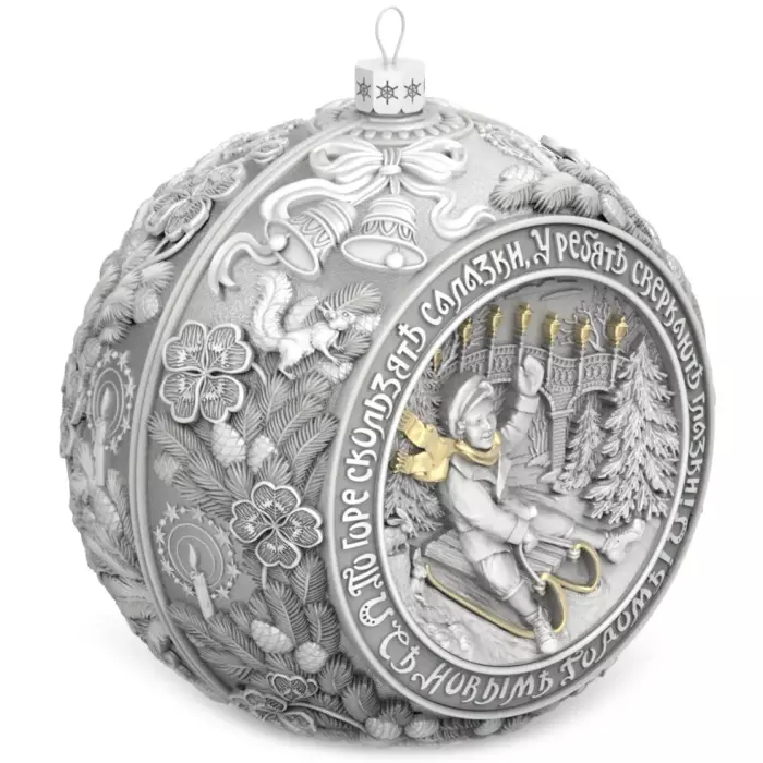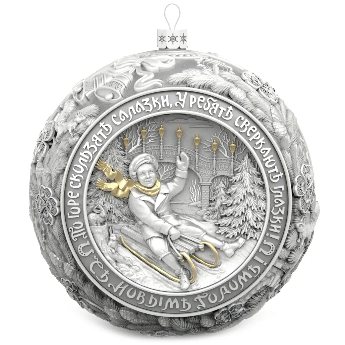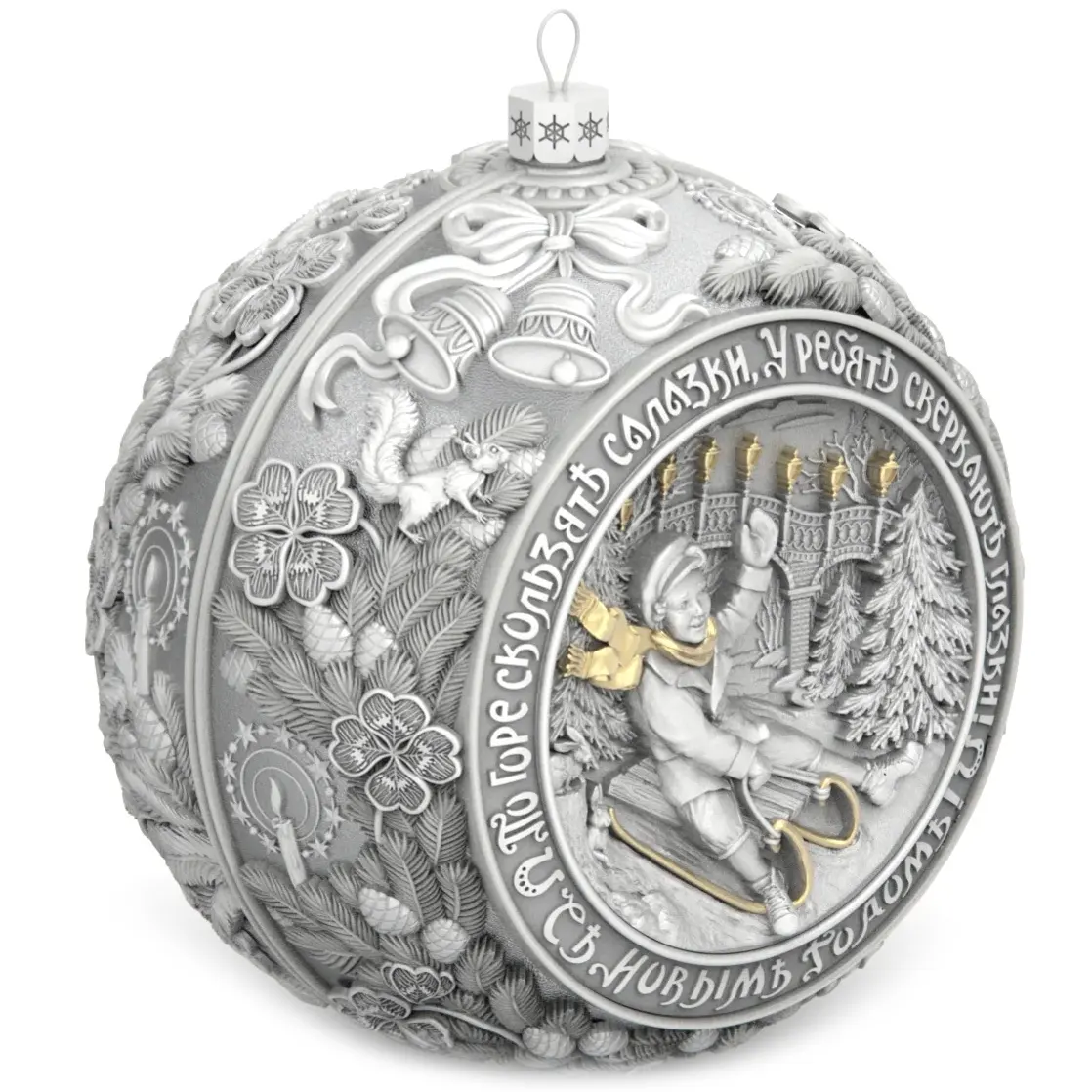 Серебряный елочный шар "Весёлые салазки" с позолотой