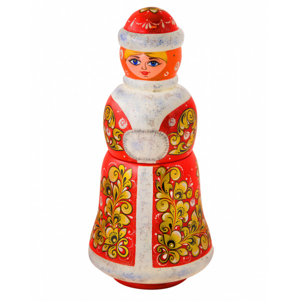 Футляр изготовлен в полном соответствии с традиционной хохломской технологией золочения. Выточен из цельного дерева вручную. Имеет авторскую роспись в технике фонового письма. Рисунок "Торжество". Лаковое покрытие и многократный высокотемпературный обжиг делает изделие влагозащищенным и износоустойчивым. Все применяемые при производстве материалы натуральны и экологичны. Футляр под штоф "Снегурочка" предназначен для хранения бутылки, служит замечательным новогодним подарком, а так же элементом декора помещения.