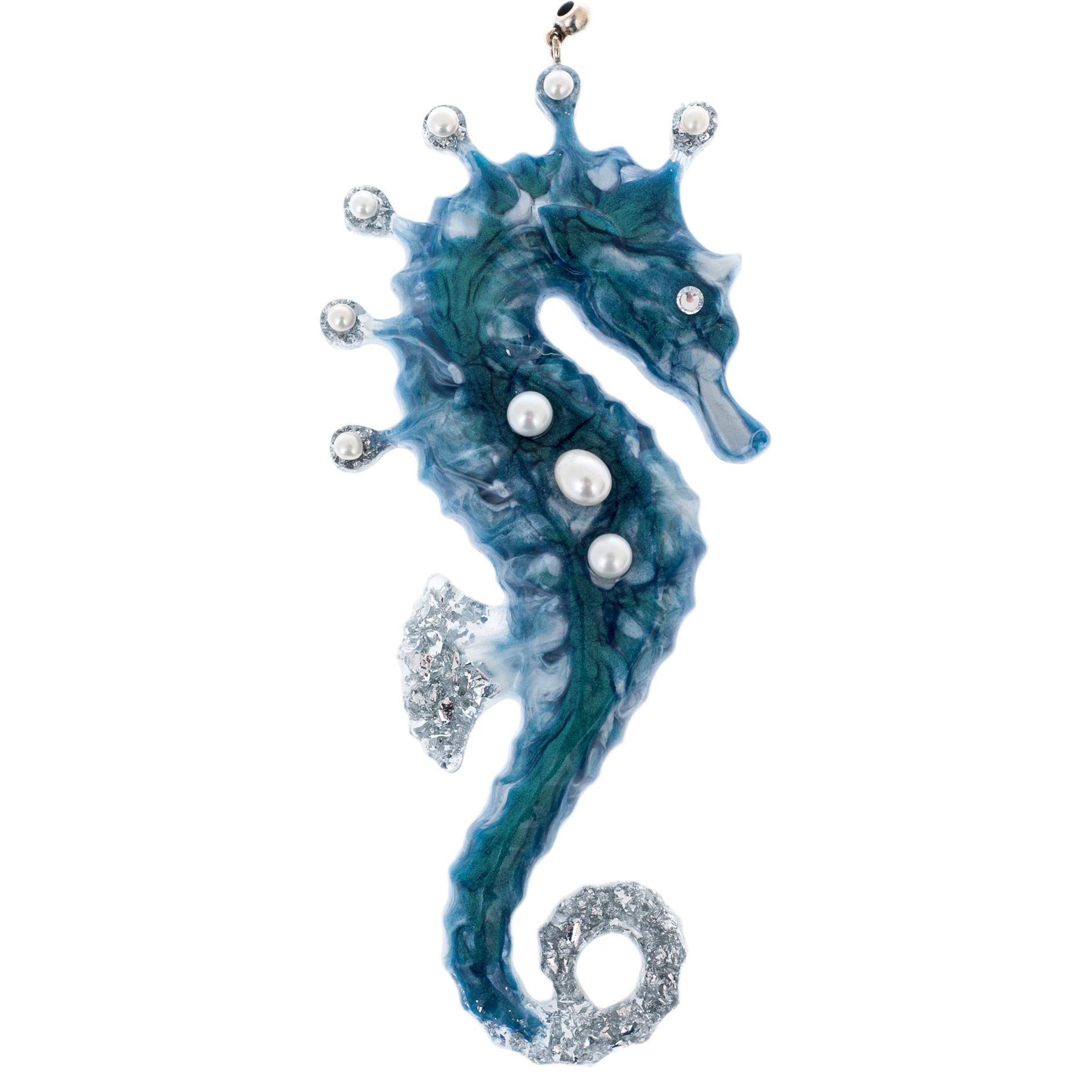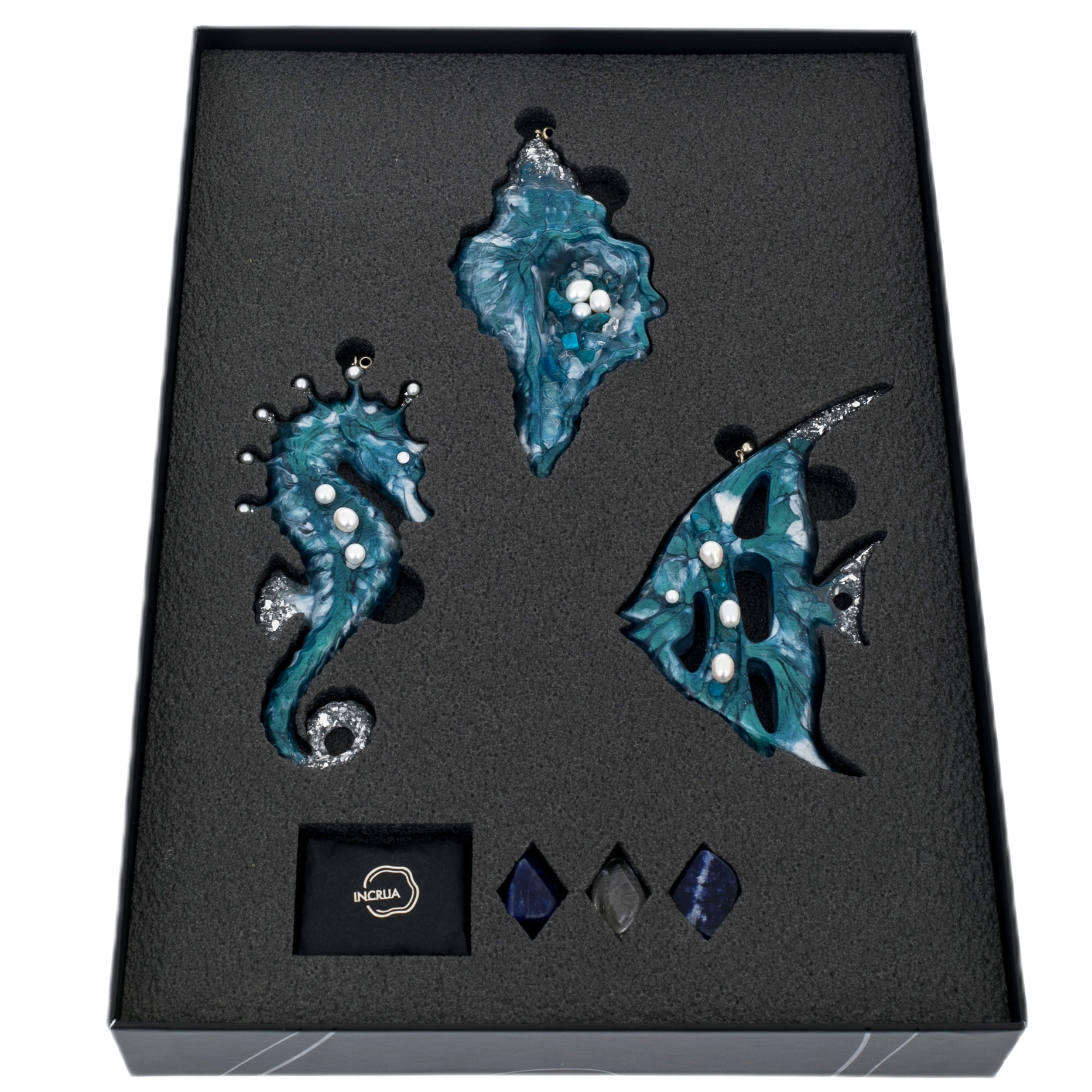 Набор ёлочных игрушек из содалита и смолы «Морской» — это воплощение прозрачной глубины океана и хрупкой красоты подводного мира. Каждая фигурка — будто застывшая капля моря, в которой сохранилось дыхание волн и перламутровое мерцание раковин.