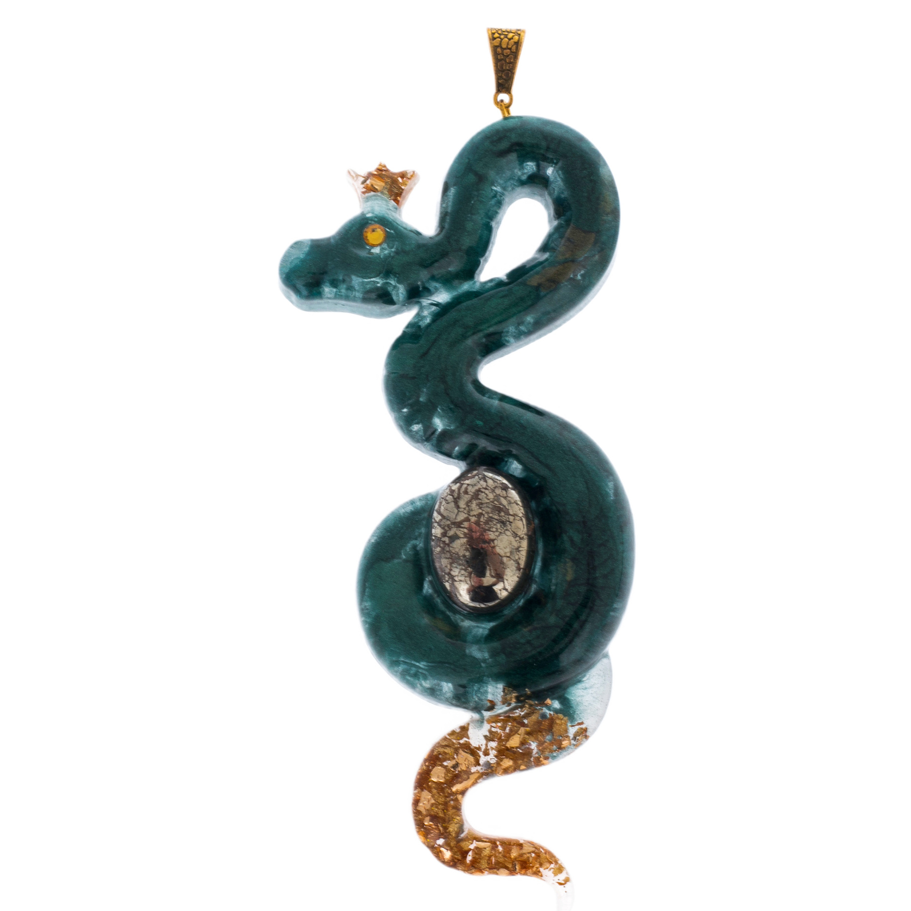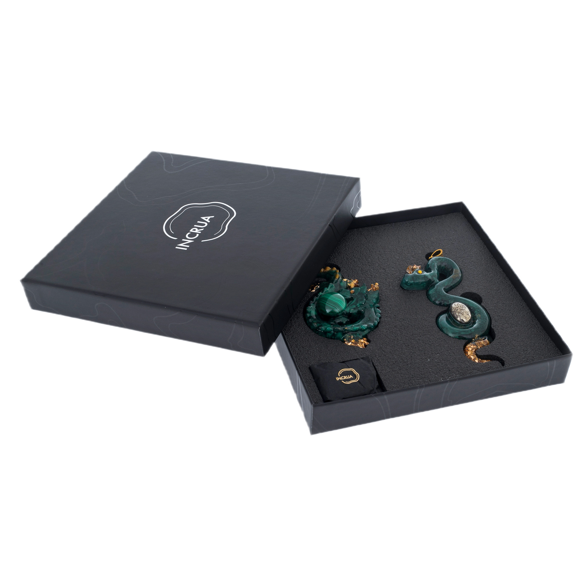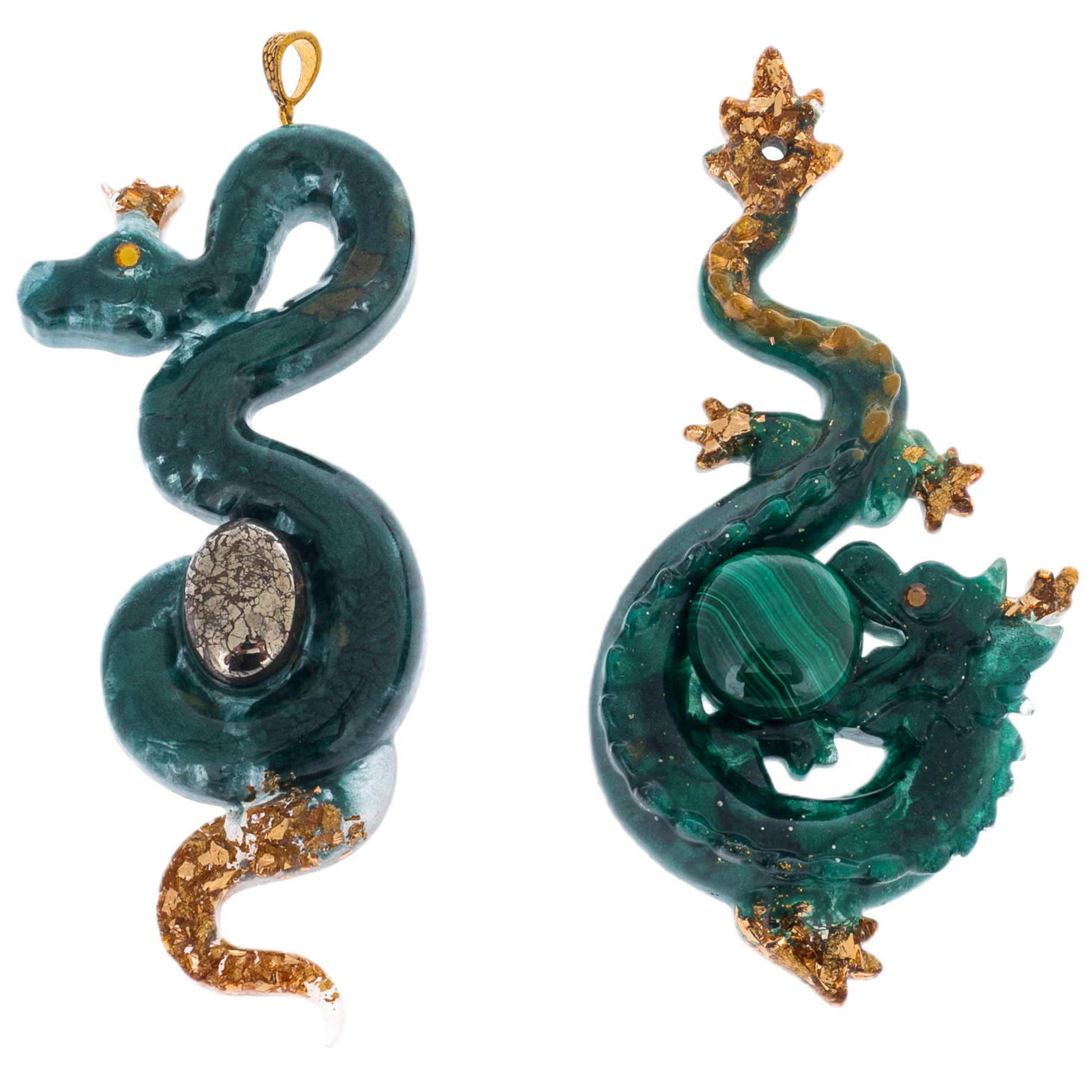 Набор ёлочных игрушек из ювелирной смолы "Stories - Дракон и Змея" с малахитом и пиритом