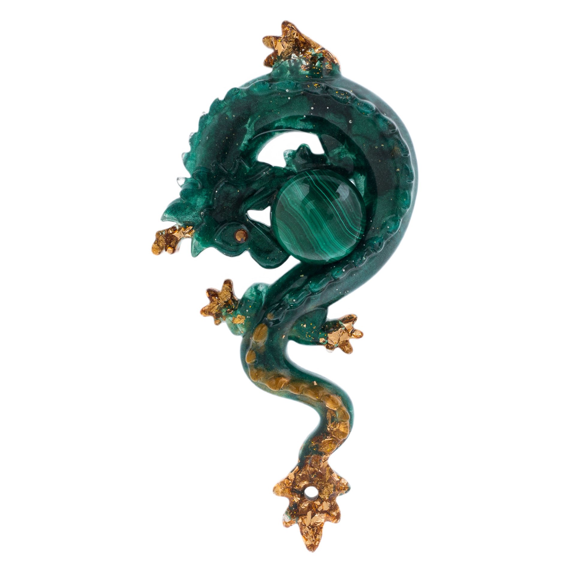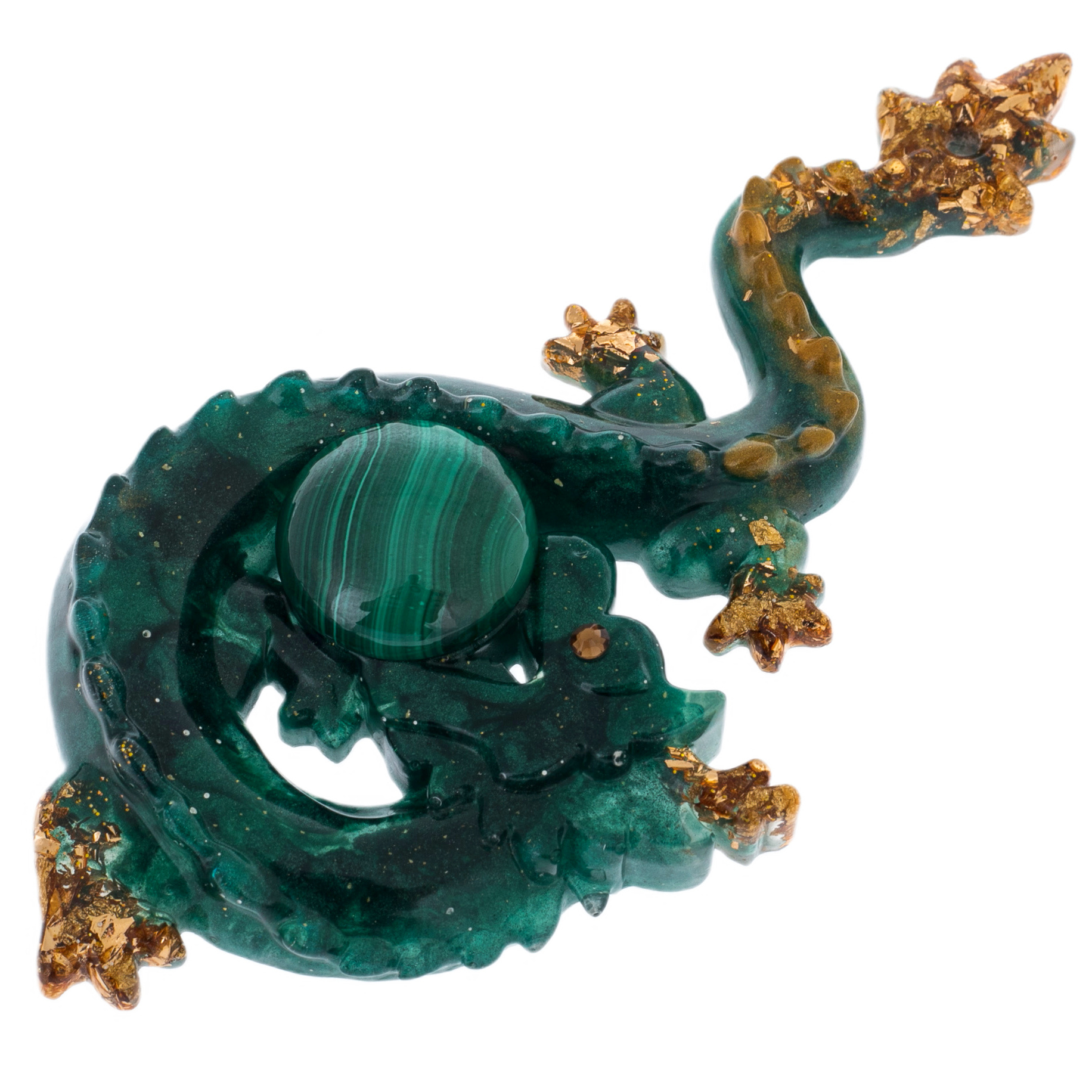 В честь этого величественного символа года, мы создали уникальную ёлочную игрушку — дракона, выполненного из ювелирной смолы с инкрустацией уральским малихитом. Глаз этого мифического создания — кристалл Swarovski, что добавляет ему ещё больше магии и блеска. Этот дракон не просто украшение, он — талисман, который призван принести в ваш дом удачу, силу и благополучие в уходящем году.