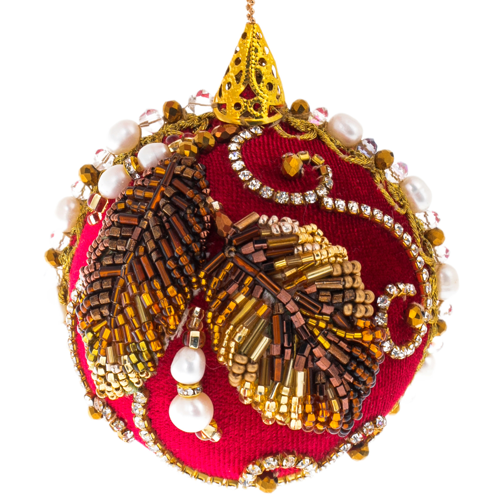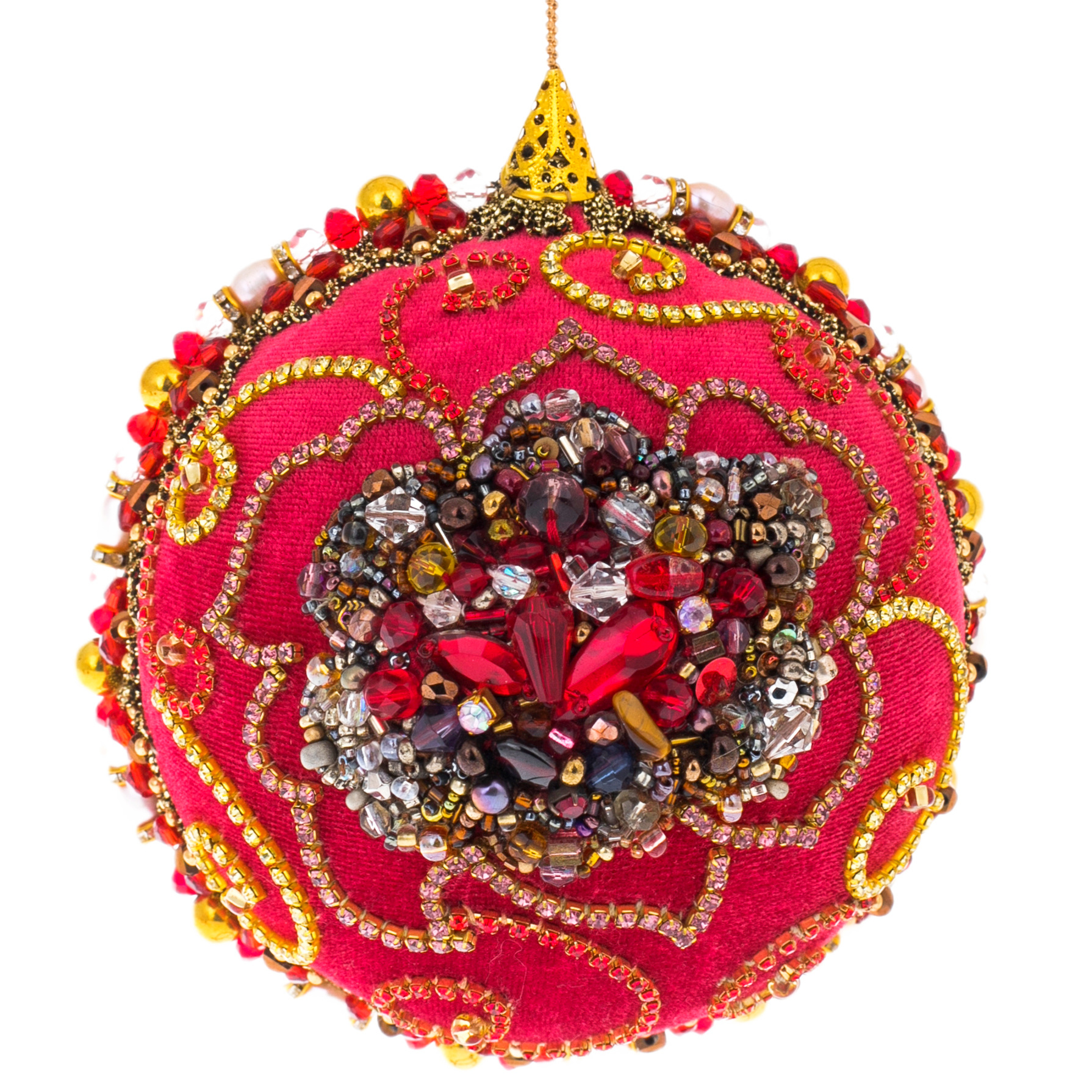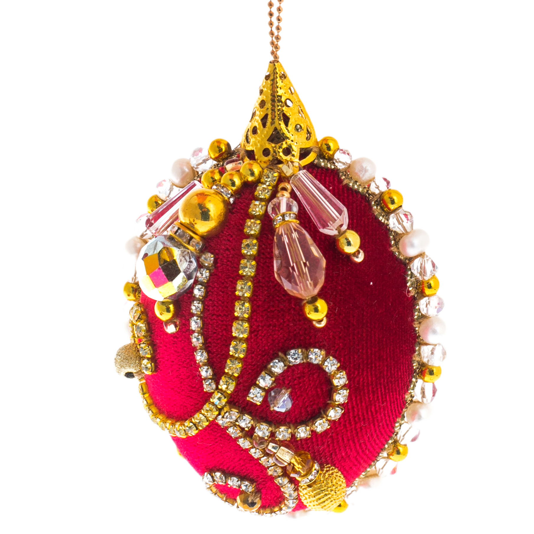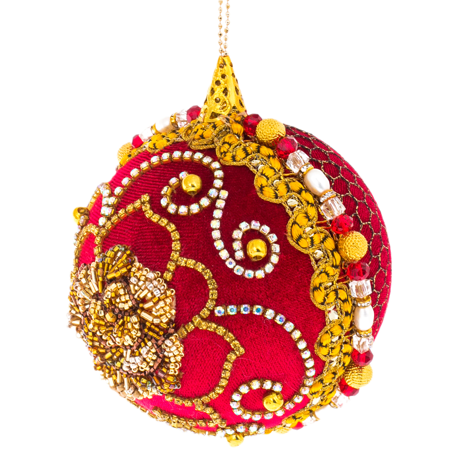 Красный бархат шаров, насыщенный, словно рубиновые россыпи, увенчан вышивкой из золотых нитей и стеклянного бисера, создающих причудливые узоры, напоминающие королевские регалии. Богатая текстура подчеркивает глубину и насыщенность красок, взывая к воспоминаниям о величественных балах и светских приемах. Золотые цепочки и инкрустации из жемчужин обвивают шары, словно ожерелья, украшающие шею императрицы.