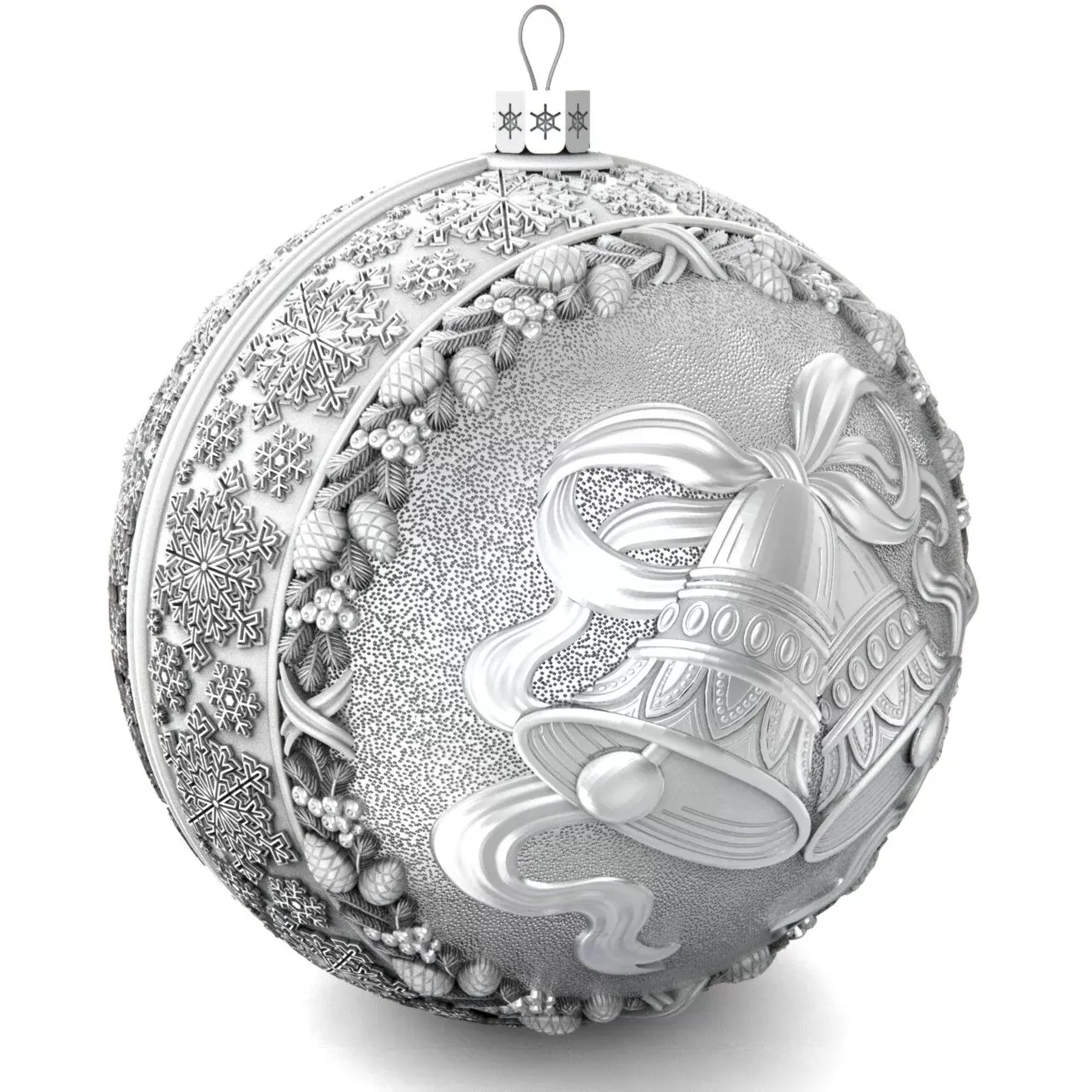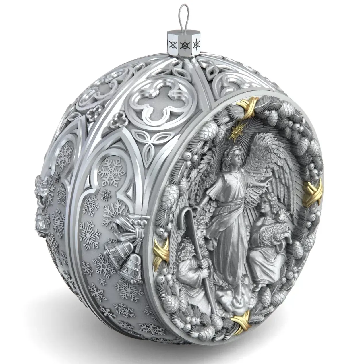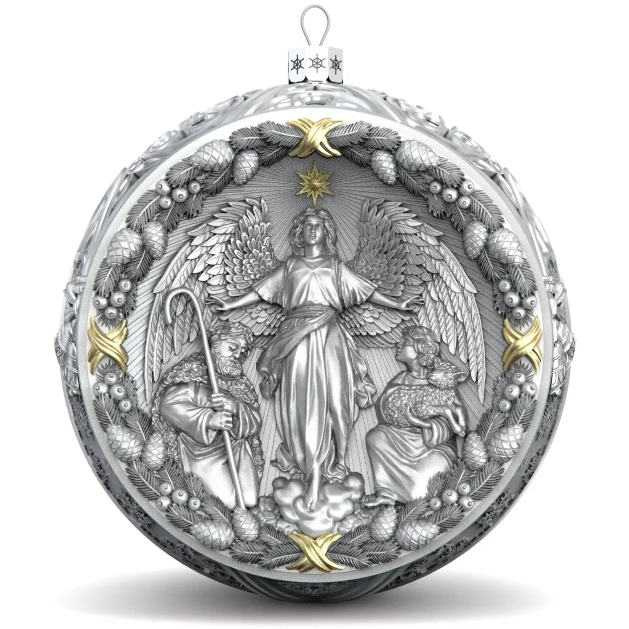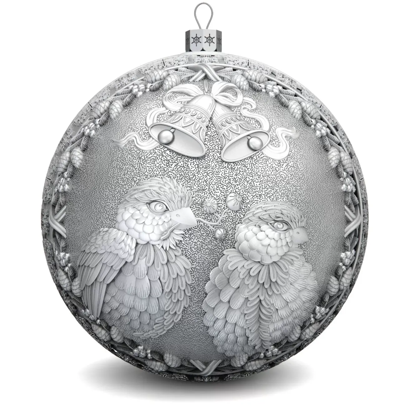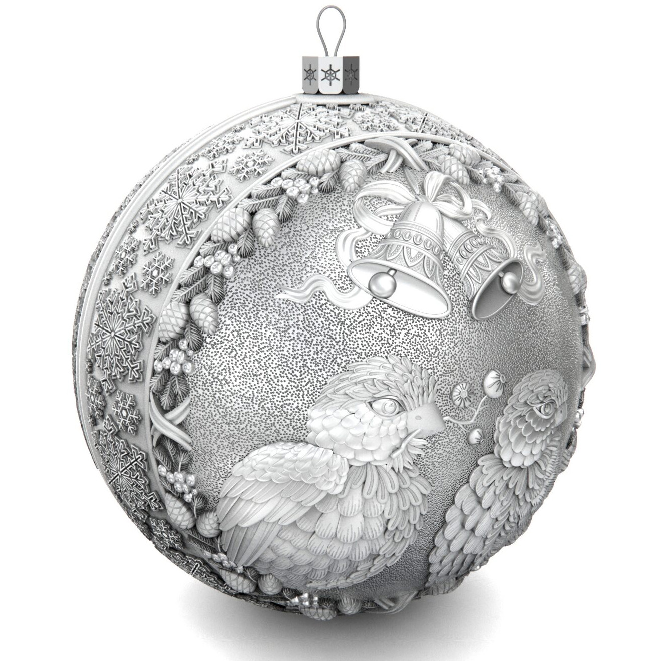 Коллекционный елочный шар с эмалью изготовлен из серебра 925 пробы, декорирован фианитами и эмалями. Игрушка имеет вес 83 грамма (вес может меняться на ± 3 грамма из-за ручного изготовления), диаметр 60 мм, высота петельки с ажурным основанием составляет 10 мм.