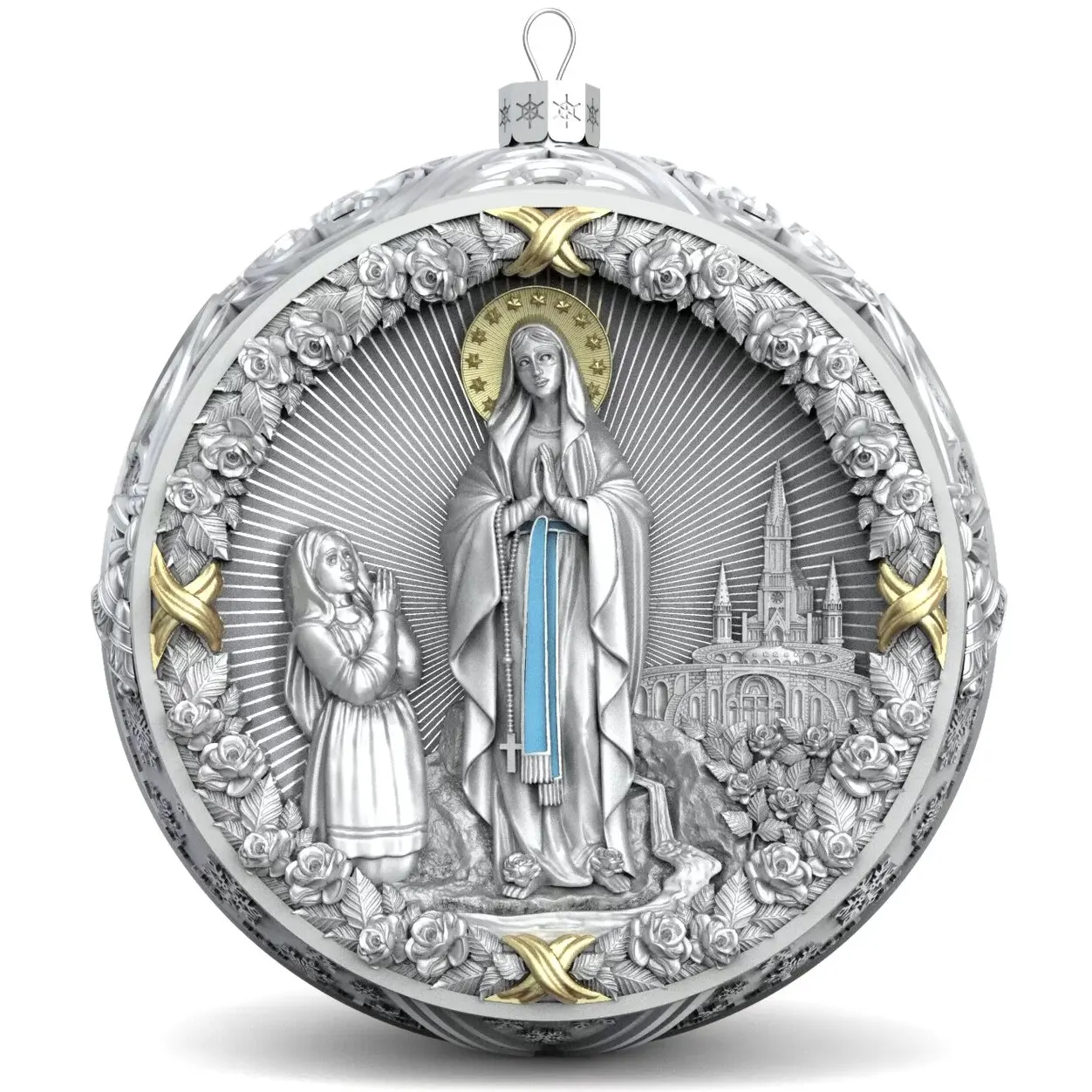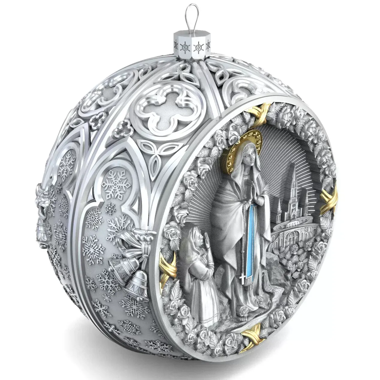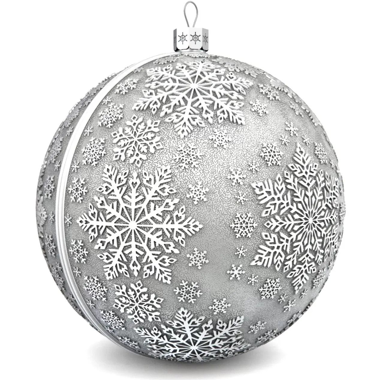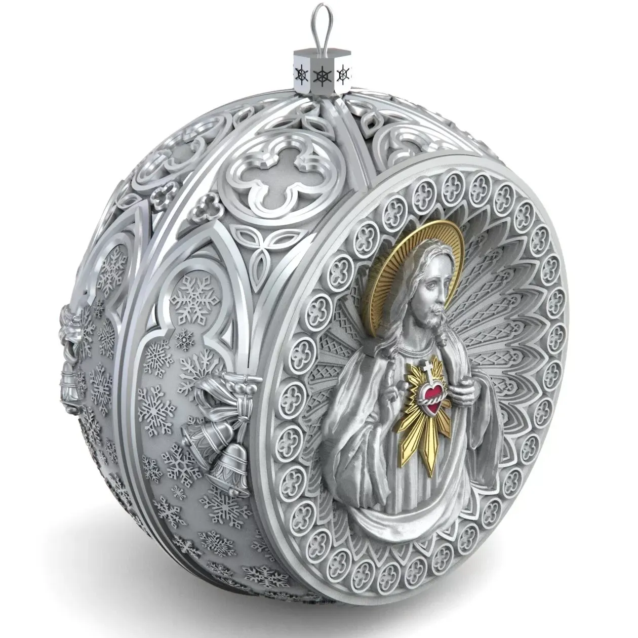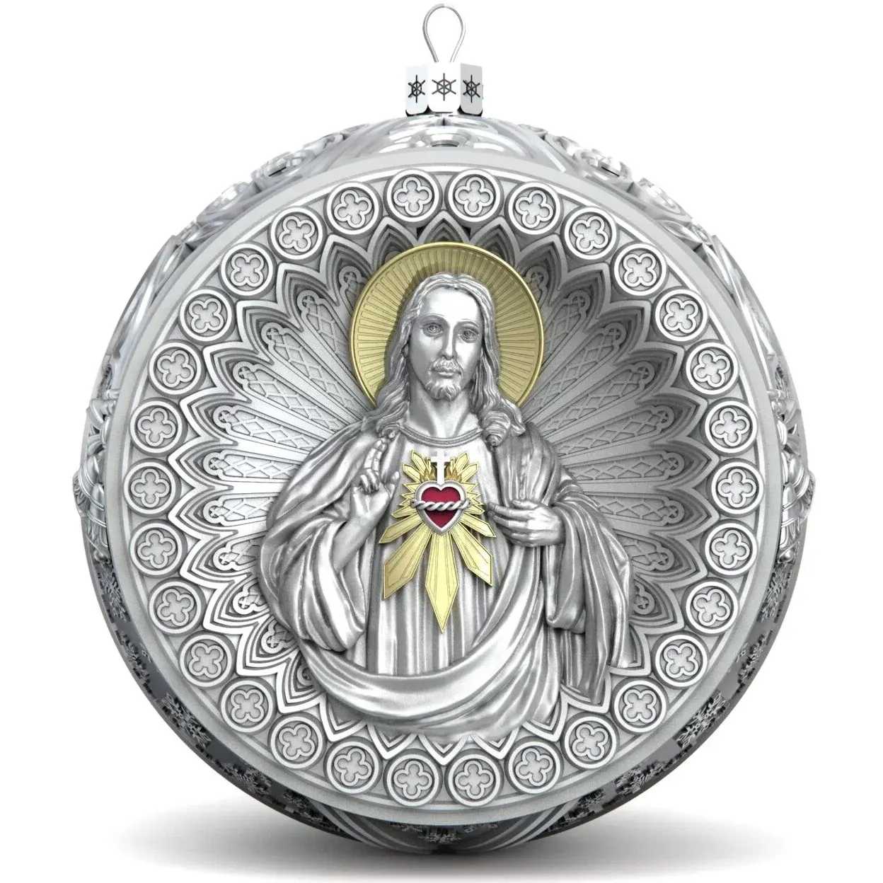 Коллекционный елочный шар с эмалью изготовлен из серебра 925 пробы, декорирован фианитами и эмалями. Игрушка имеет вес 83 грамма (вес может меняться на ± 3 грамма из-за ручного изготовления), диаметр 60 мм, высота петельки с ажурным основанием составляет 10 мм.