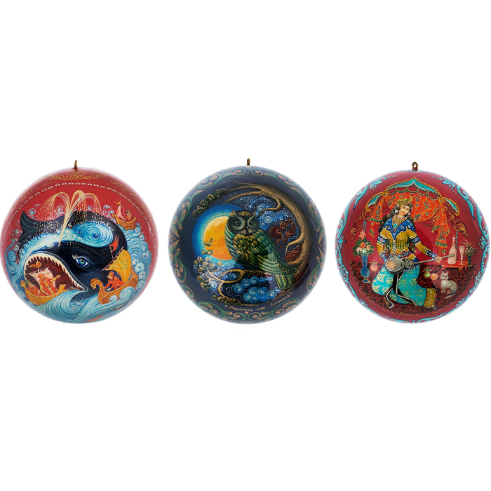 Комплектация: Шар "Конек-горбунок" № 156 Чапарина Н., "Сова" № 251 Богатиков С., "Девушка с инструментом" № 216 Чапарина Н.
