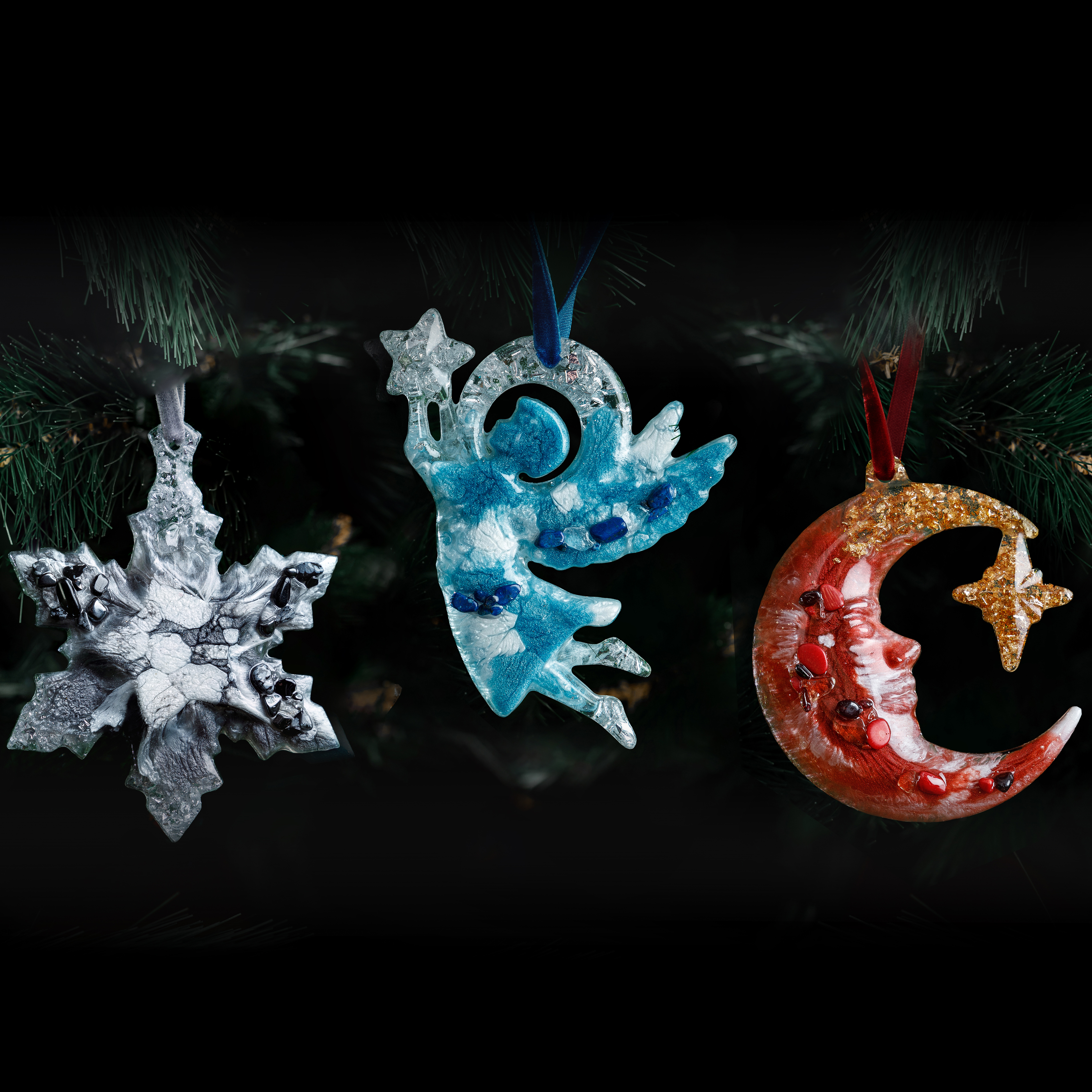 Уважаемые покупатели, возможен выбор формы (снежинка / ангел / полумесяц) и цвета (белый / красный / синий) игрушек.
