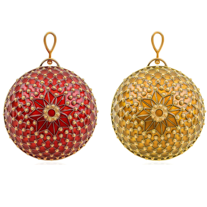 На поверхности шаров раскрывается ювелирная композиция, построенная на чередовании крупных и малых элементов: яркие восьмиконечные звезды, собранные из лучей, окружены множеством крошечных накладок, выполняющих роль световых акцентов. Эмалевое стекло, равномерно растекающееся по фактурной поверхности, формирует глубокие цветовые переходы — от насыщенного рубина к винному оттенку и от тёплого медового к плотному янтарному. В верхней части каждого шара закреплена изящная петля-держатель с плавным изгибом, также покрытая золочением, создающим единство всей композиции.