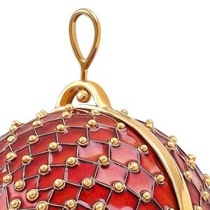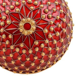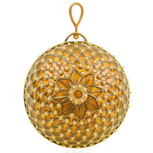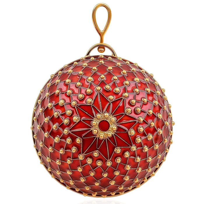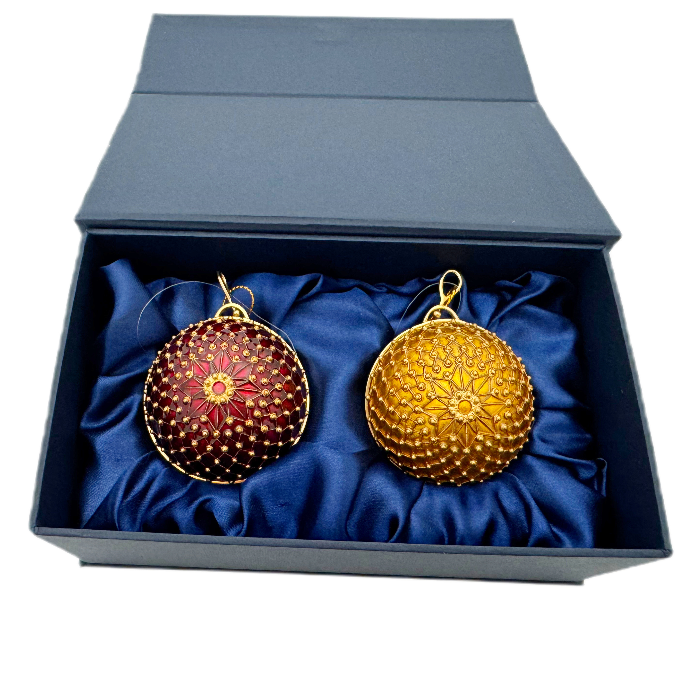 Набор из двух ёлочных шаров «Новогодний» создан в лучших традициях эмалево-филигранного искусства, объединяющего ювелирную точность и праздничную торжественность. Каждый шар выполнен на основе медной формы, покрытой прозрачной горячей эмалью глубокого рубинового и тёплого золотистого оттенков. Под тончайшим слоем эмали мерцает рельефная сетка из филигранных нитей, образующая звёздчатый орнамент, собранный из миниатюрных ячеек, подсвеченных золотым блеском. Металлический каркас покрыт ровным золочением, усиливающим игру света и создающим эффект живого сияния.