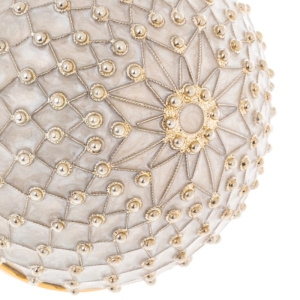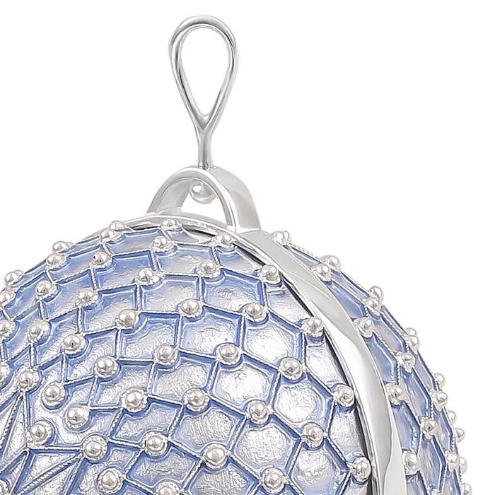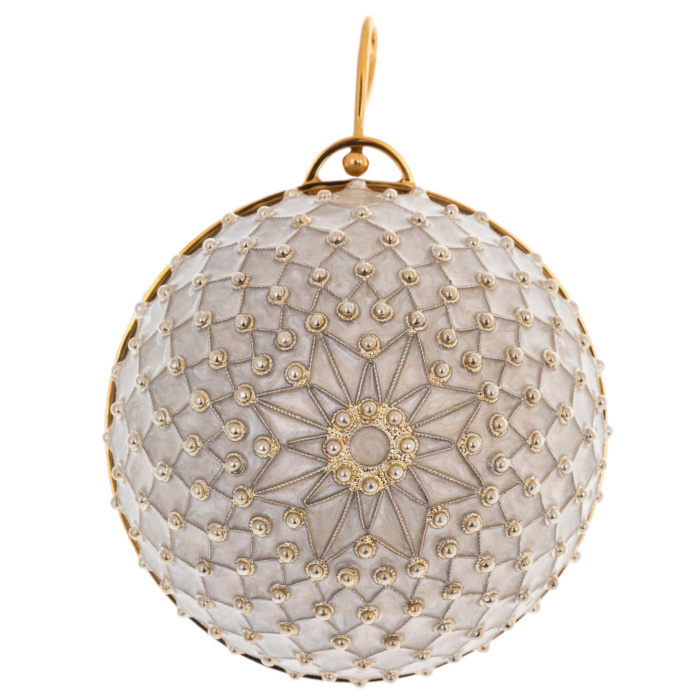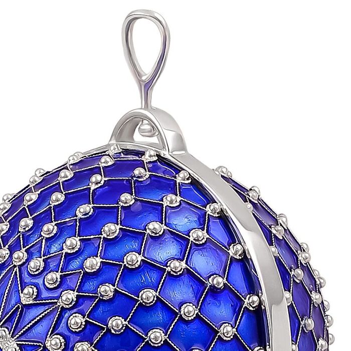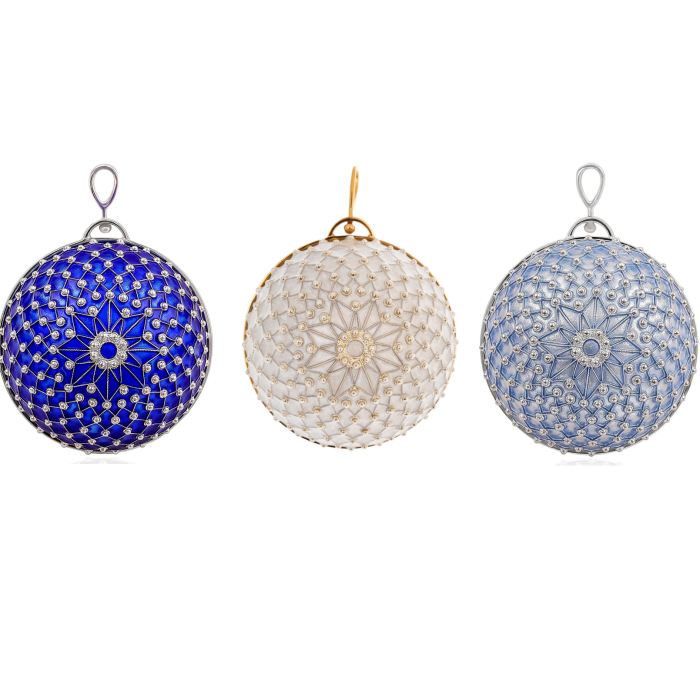 Каждый шар рождается в процессе, требующем филигранной точности и высочайшего мастерства: эмаль наносится вручную, обжигается несколько раз для достижения глубины цвета, золотые нити филиграни укладываются с той тщательностью, которая обычно свойственна работе с драгоценными камнями. Благодаря этому поверхность приобретает особую игру света — мягкое сияние живёт внутри эмали, словно тлеющий зимний огонь. Золочёные элементы подчёркивают архитектурность узора и создают ощущение ювелирного рельефа, читающегося даже на расстоянии.
