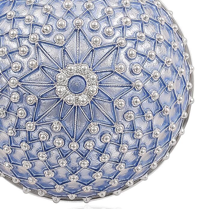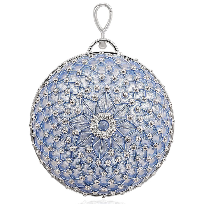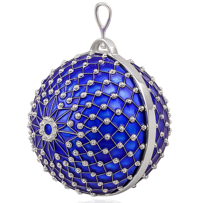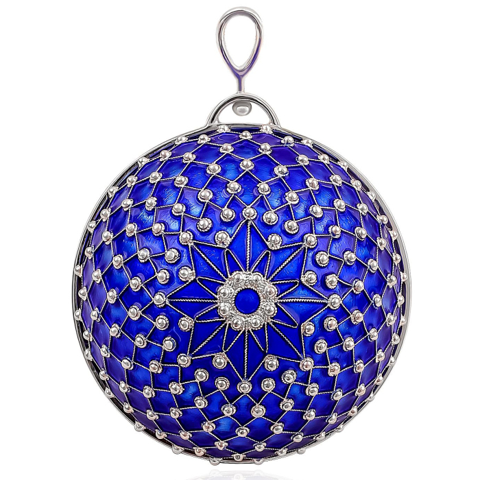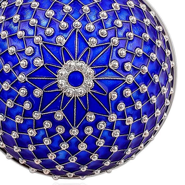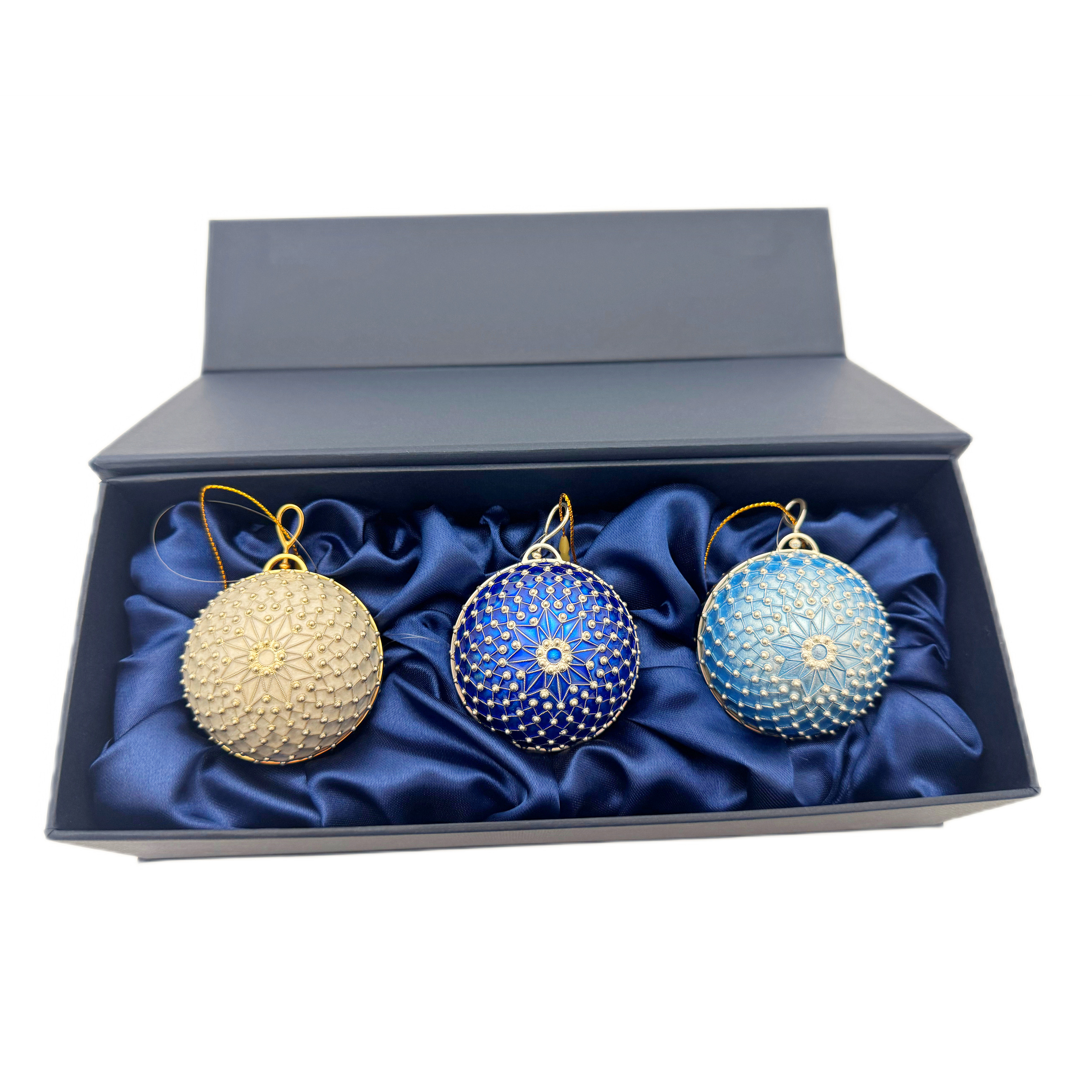 Набор включает три изысканных елочных шара, выполненных в эмалево-филигранной технике, восходящей к лучшим традициям русских ювелирных мастерских. Каждый шар создан на основе медной формы, покрытой многослойной горячей эмалью глубоких, чистых оттенков — насыщенного кобальтового, нежно-голубого и жемчужно-белого. Сквозь прозрачный блеск эмали проступает тонкое филигранное плетение, образующее объемный узор из сотен миниатюрных ячеек, обрамлённых золочёными линиями. Центральную часть украшает восьмиконечная звезда, собранная из изящных лучей, расходящихся по поверхности идеальной сферой.