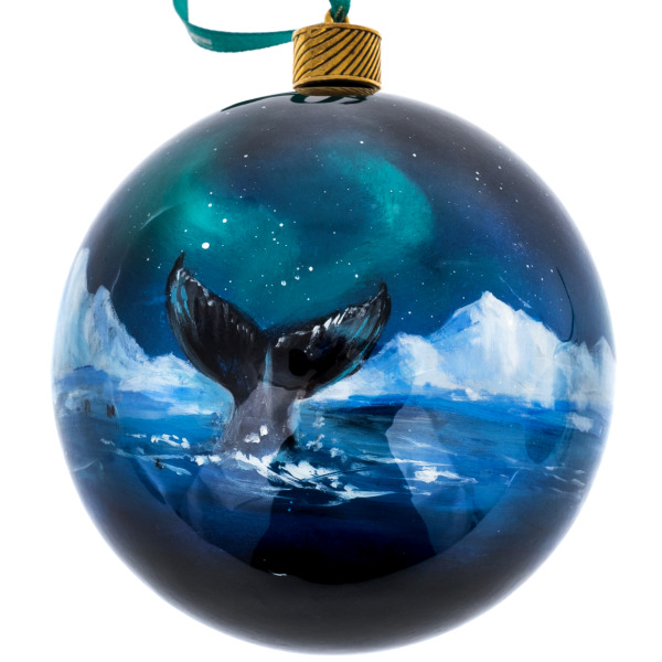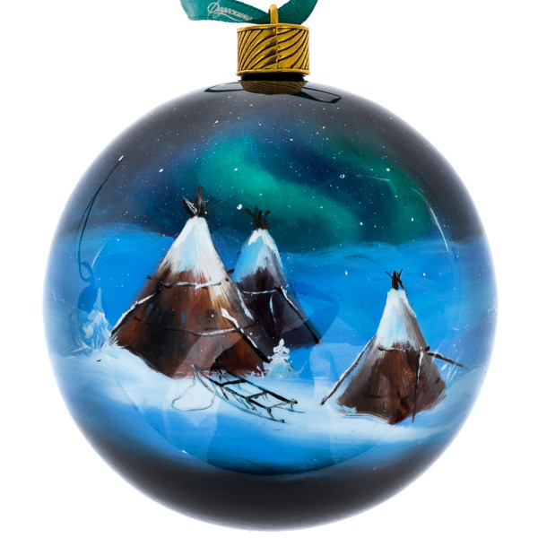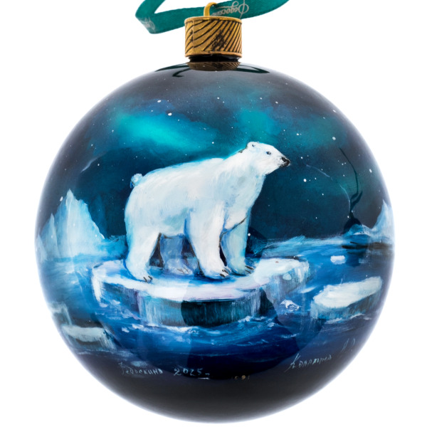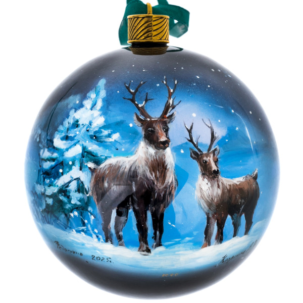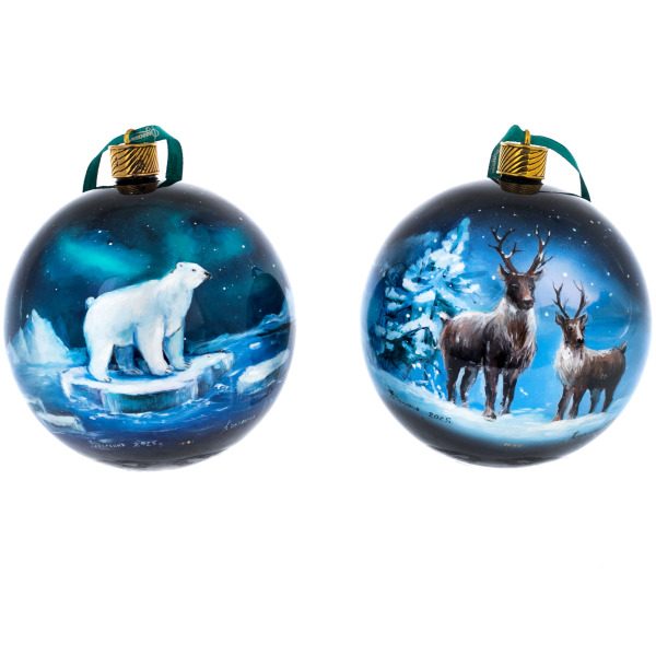 Каждое изделие выполнено вручную из папье-маше, расписано масляными красками и покрыто многослойным лаком, придающим изображению глубину и кристальную прозрачность. На шарах изображены символы Арктики — белый медведь на ледяной глыбе под сиянием северного сияния и величественные северные олени на фоне заснеженного леса. Художник передал мягкое свечение морозного воздуха и магию зимней тишины, когда природа замирает в ожидании света.