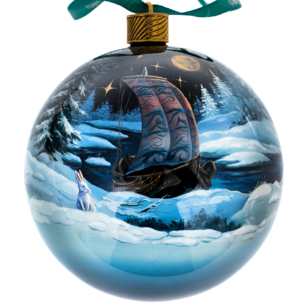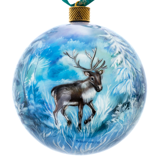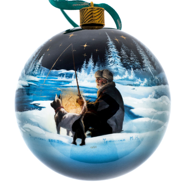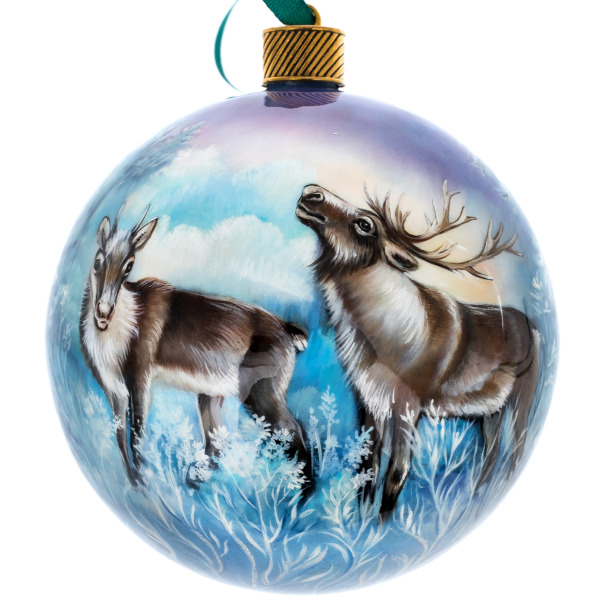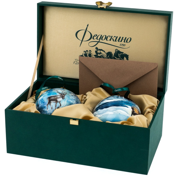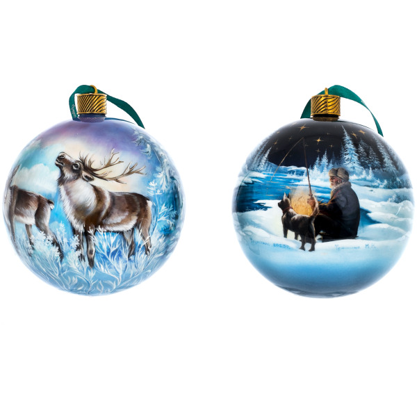 Каждый шар изготовлен вручную из папье-маше, расписан маслом и покрыт прозрачным лаком, придающим изображению глубину и сияние. На одном из шаров изображены величественные северные олени — воплощение силы и свободы, на другом — зимний пейзаж с рыбаком у костра, символ спокойствия и человеческого единения с природой. Художник мастерски передаёт игру света на снегу, холодное дыхание зимы и мягкое сияние звёзд.