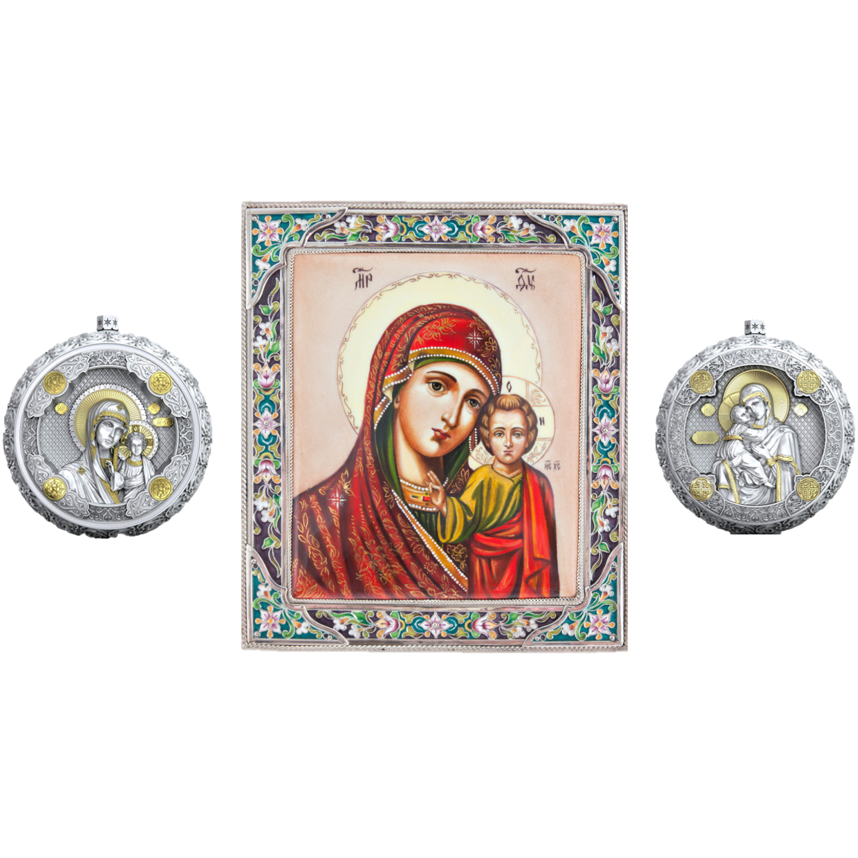 Комплектация:Икона "Казанская Богоматерь в красном" с финифтью, Серебряный елочный шар "Владимирская Богородица", Серебряный елочный шар "Казанская Богородица".