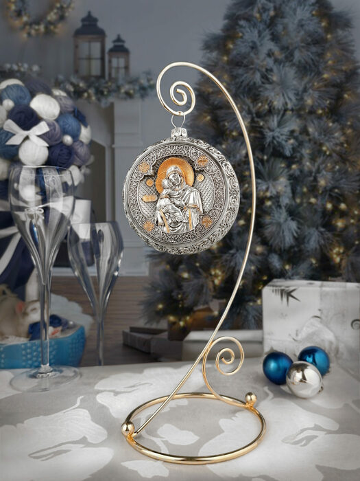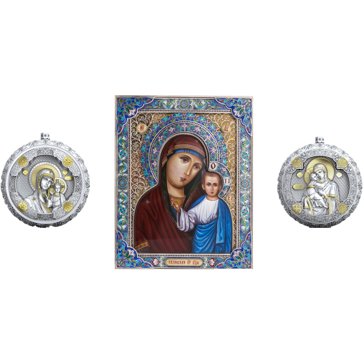 Комплектация: Серебряная икона с финифтью "Матерь Божья Казанская", Серебряный елочный шар "Владимирская Богородица", Серебряный елочный шар "Казанская Богородица".
