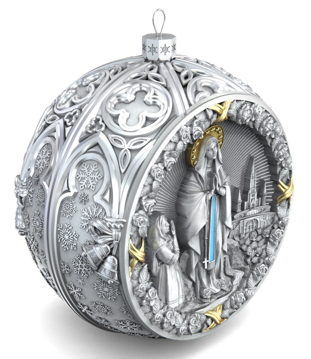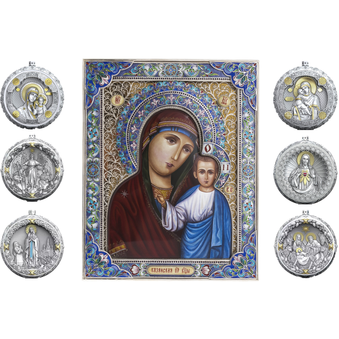 Набор подарочный с шарами и иконой "Матерь Божья Казанская в красном" из серебра, 6 шаров