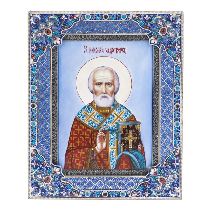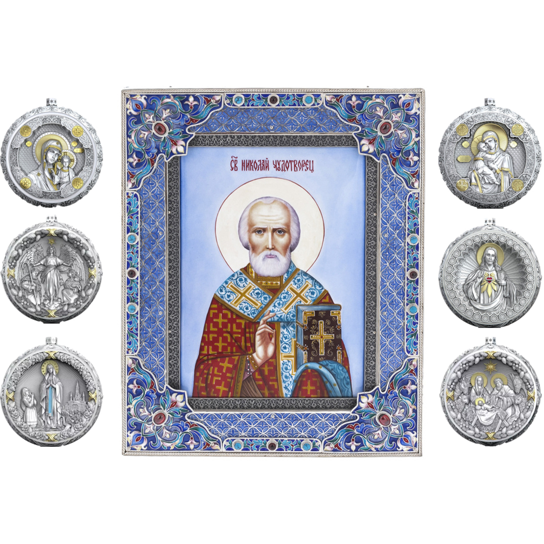 Набор подарочный с шарами и иконой "Николай Чудотворец" из серебра, 6 шаров