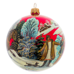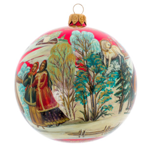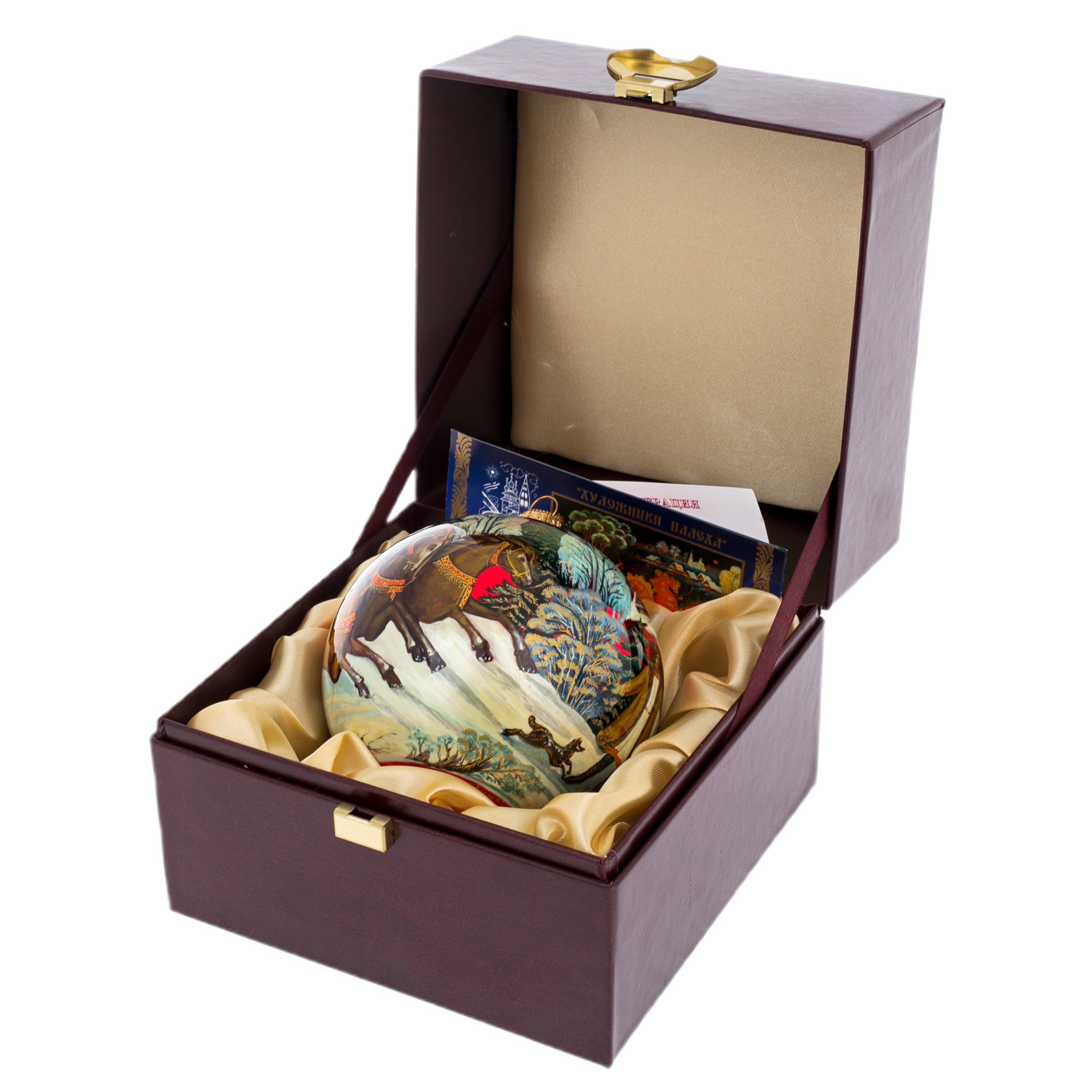 Этот елочный шар создан в традициях палехской миниатюры, прославившейся филигранной прорисовкой деталей и глубокой поэтичностью образов. Ручная роспись ложится на идеальную поверхность шара тонкими, почти ювелирными линиями, придавая ему характер художественного объекта, а не просто праздничного аксессуара. Каждая мазковая тень, каждая золотая нить орнамента вписывается в канон лаковой живописи, формируя впечатление драгоценной миниатюры, перенесенной на объемную сферу.