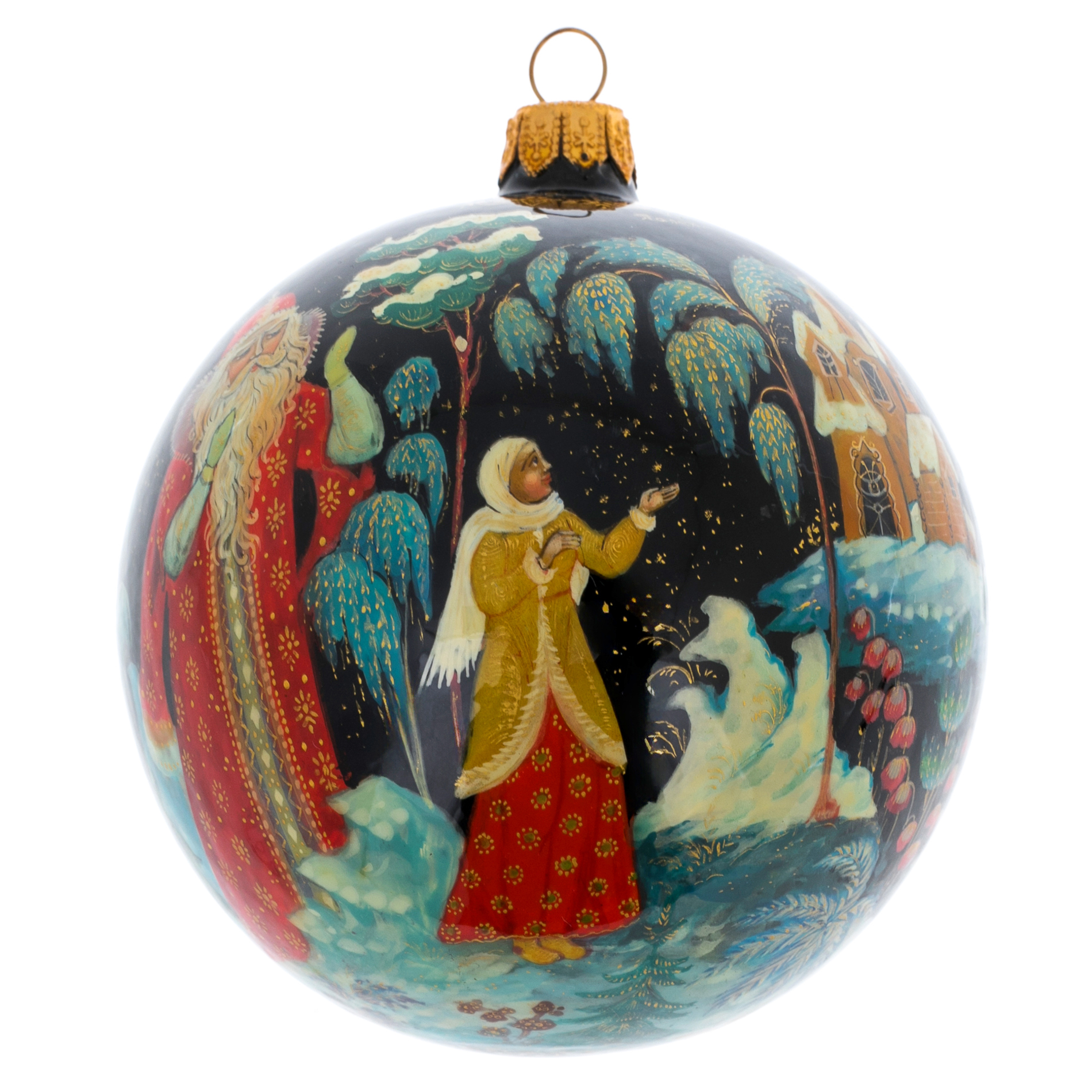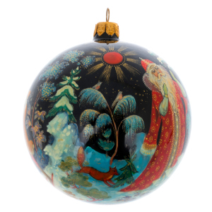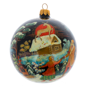 Этот елочный шар создан в традициях палехской миниатюры, прославившейся филигранной прорисовкой деталей и глубокой поэтичностью образов. Ручная роспись ложится на идеальную поверхность шара тонкими, почти ювелирными линиями, придавая ему характер художественного объекта, а не просто праздничного аксессуара. Каждая мазковая тень, каждая золотая нить орнамента вписывается в канон лаковой живописи, формируя впечатление драгоценной миниатюры, перенесенной на объемную сферу.
