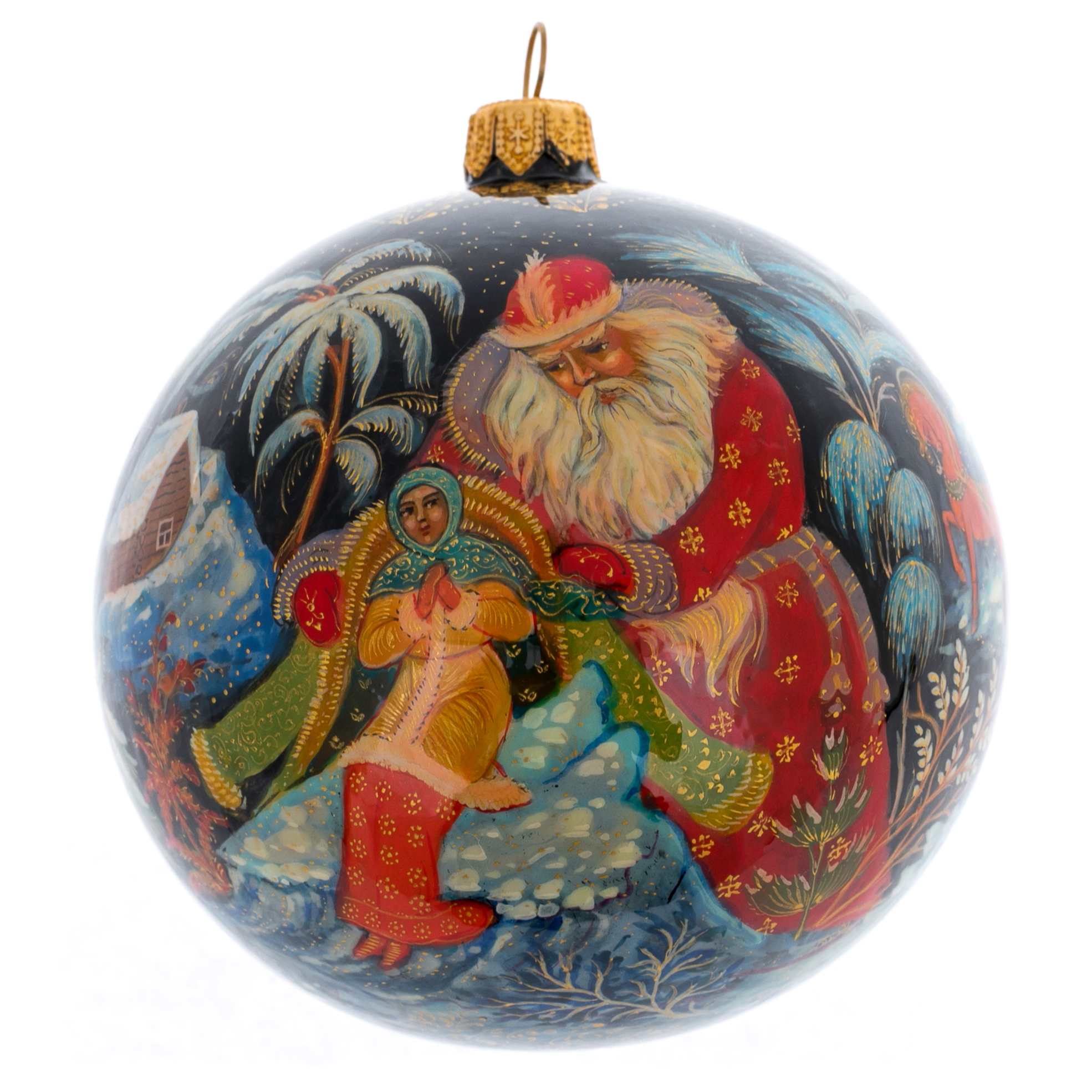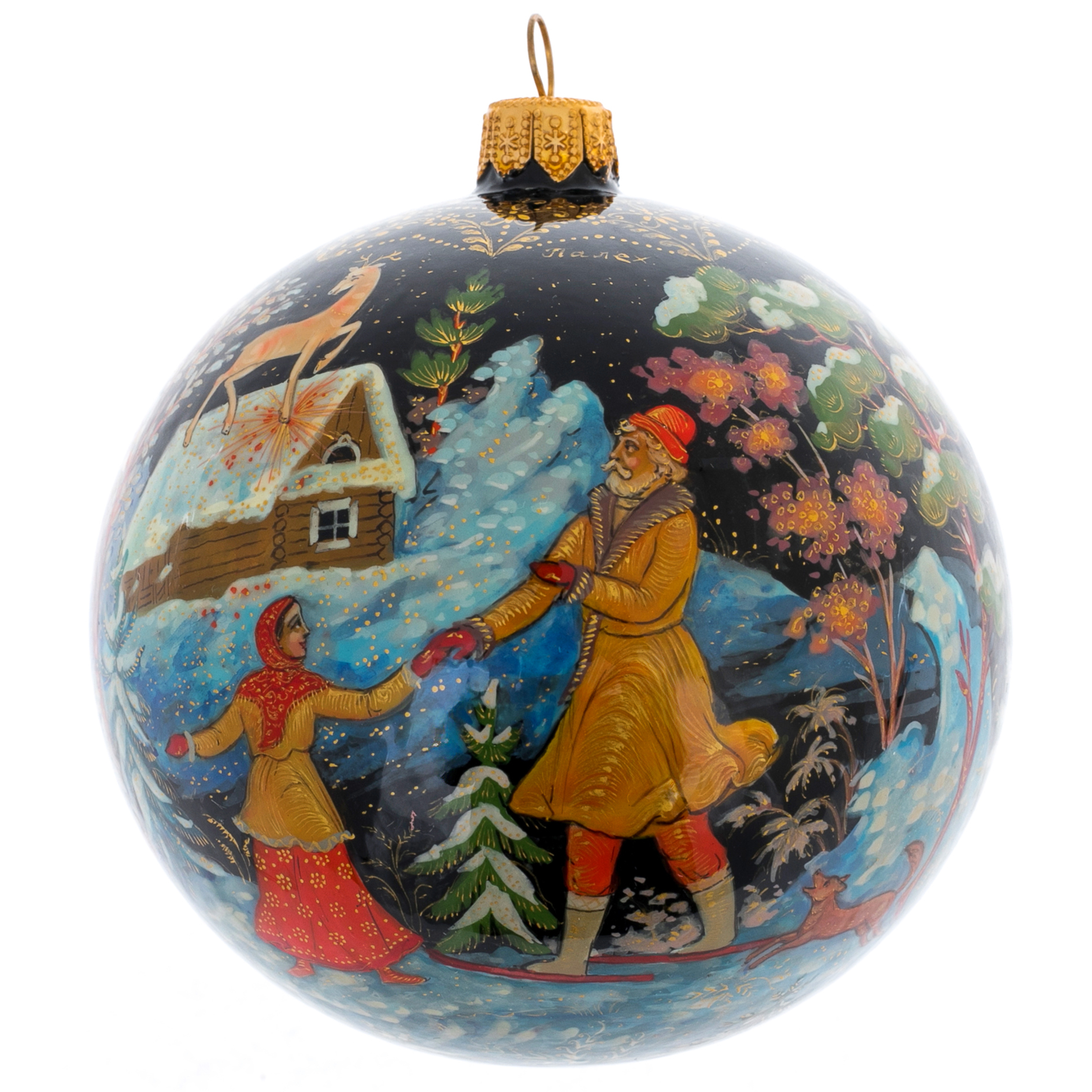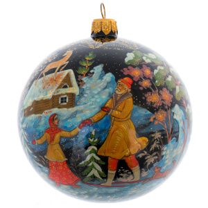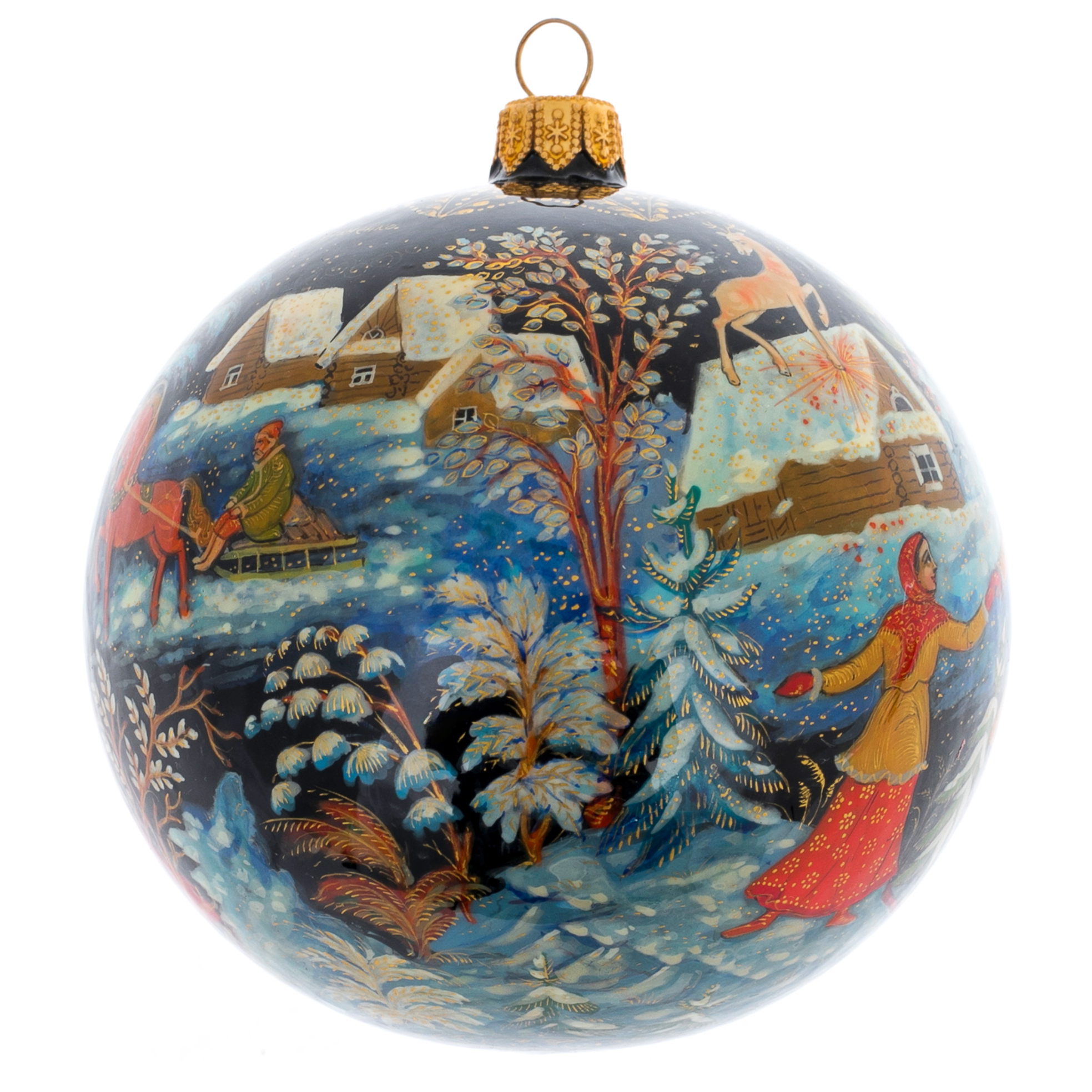 Этот елочный шар создан в традициях палехской миниатюры, прославившейся филигранной прорисовкой деталей и глубокой поэтичностью образов. Ручная роспись ложится на идеальную поверхность шара тонкими, почти ювелирными линиями, придавая ему характер художественного объекта, а не просто праздничного аксессуара. Каждая мазковая тень, каждая золотая нить орнамента вписывается в канон лаковой живописи, формируя впечатление драгоценной миниатюры, перенесенной на объемную сферу.