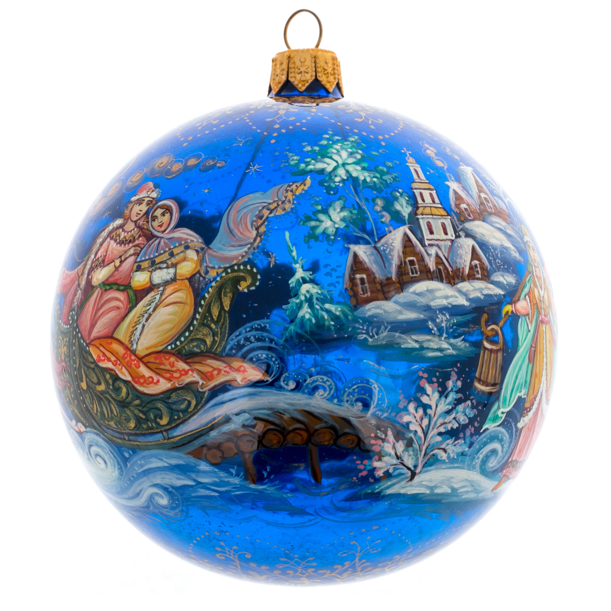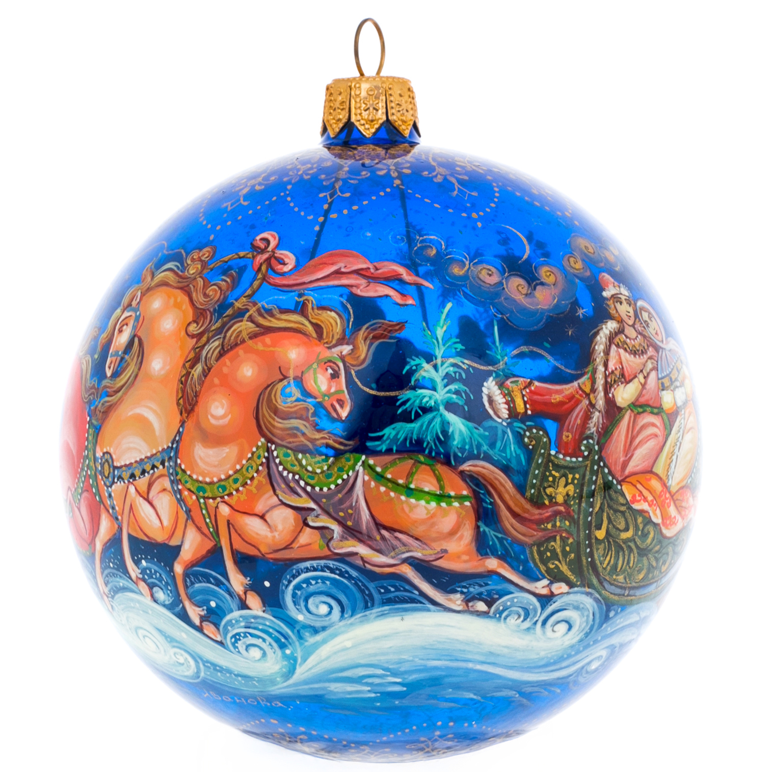 Этот елочный шар создан в традициях палехской миниатюры, прославившейся филигранной прорисовкой деталей и глубокой поэтичностью образов. Ручная роспись ложится на идеальную поверхность шара тонкими, почти ювелирными линиями, придавая ему характер художественного объекта, а не просто праздничного аксессуара. Каждая мазковая тень, каждая золотая нить орнамента вписывается в канон лаковой живописи, формируя впечатление драгоценной миниатюры, перенесенной на объемную сферу.