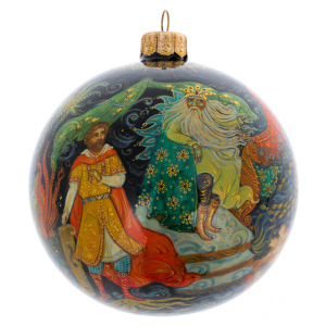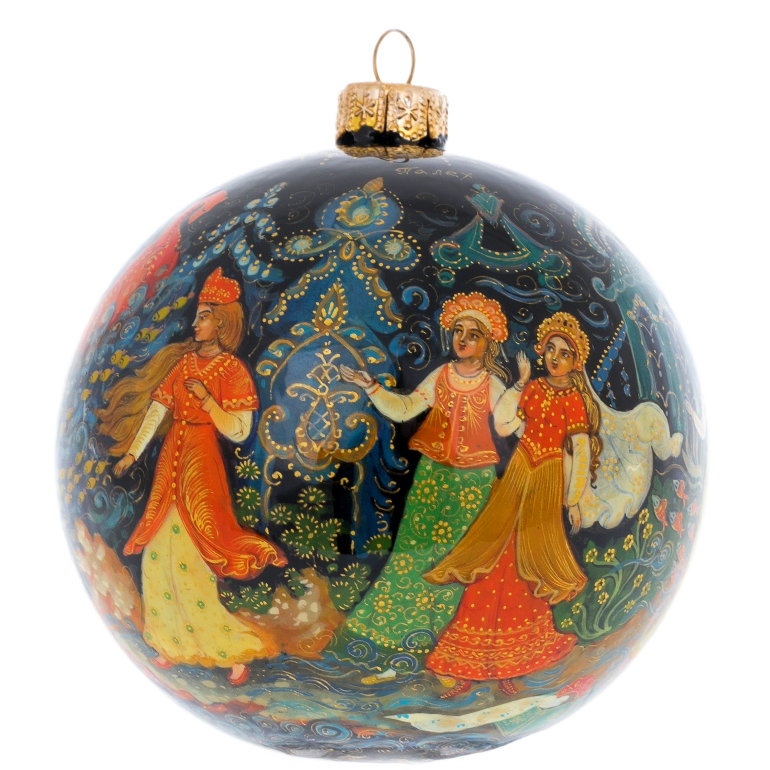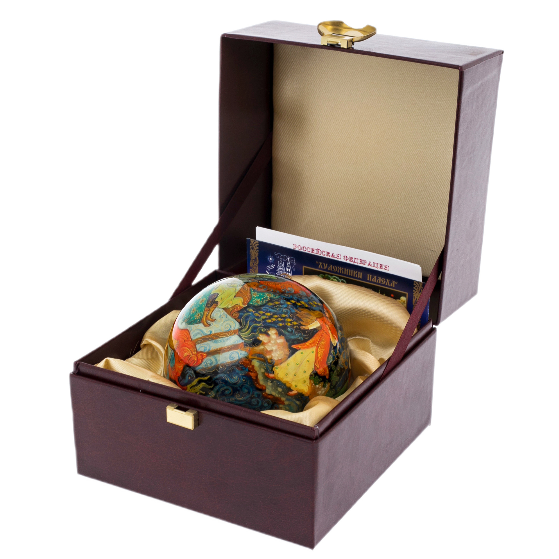 Этот елочный шар создан в традициях палехской миниатюры, прославившейся филигранной прорисовкой деталей и глубокой поэтичностью образов. Ручная роспись ложится на идеальную поверхность шара тонкими, почти ювелирными линиями, придавая ему характер художественного объекта, а не просто праздничного аксессуара. Каждая мазковая тень, каждая золотая нить орнамента вписывается в канон лаковой живописи, формируя впечатление драгоценной миниатюры, перенесенной на объемную сферу.