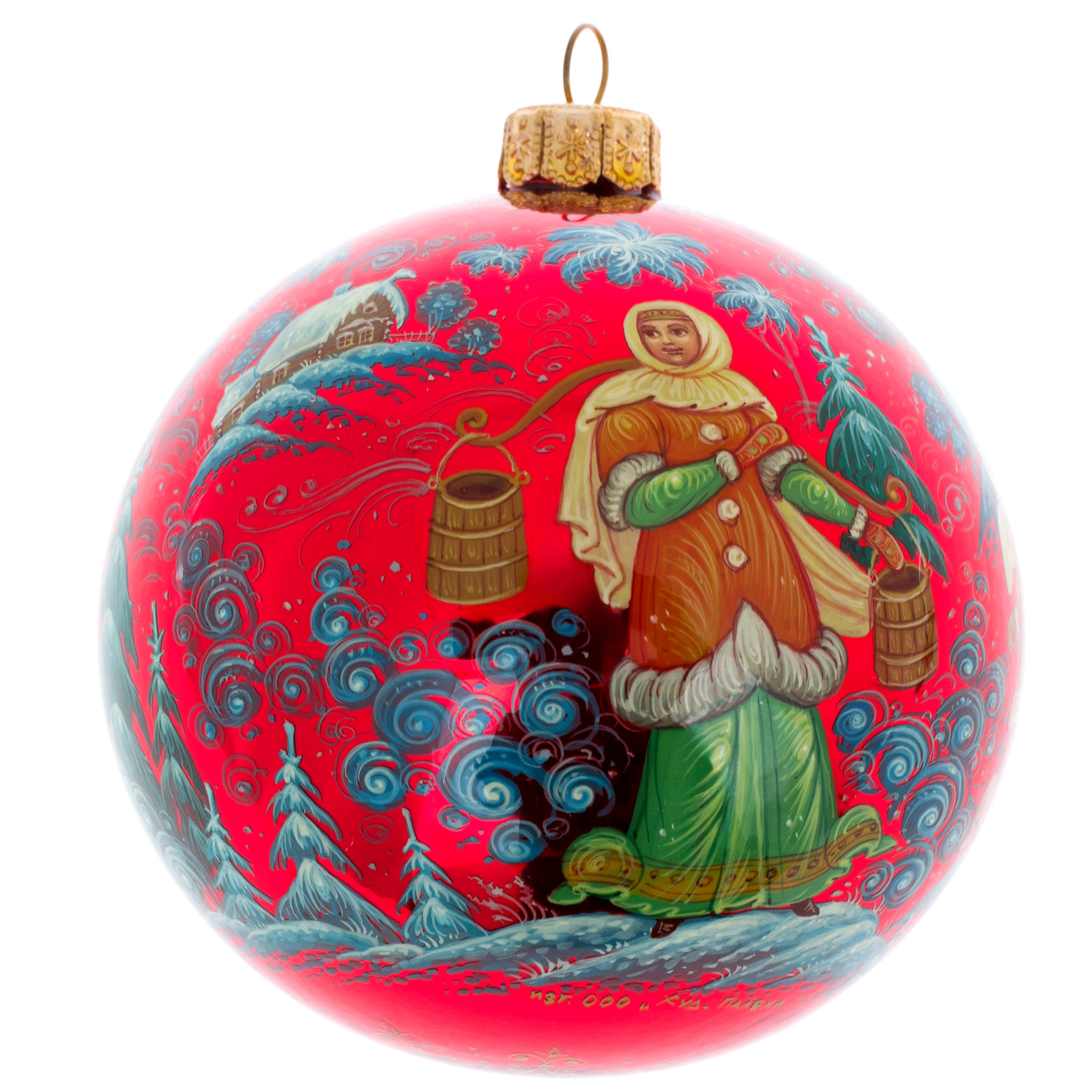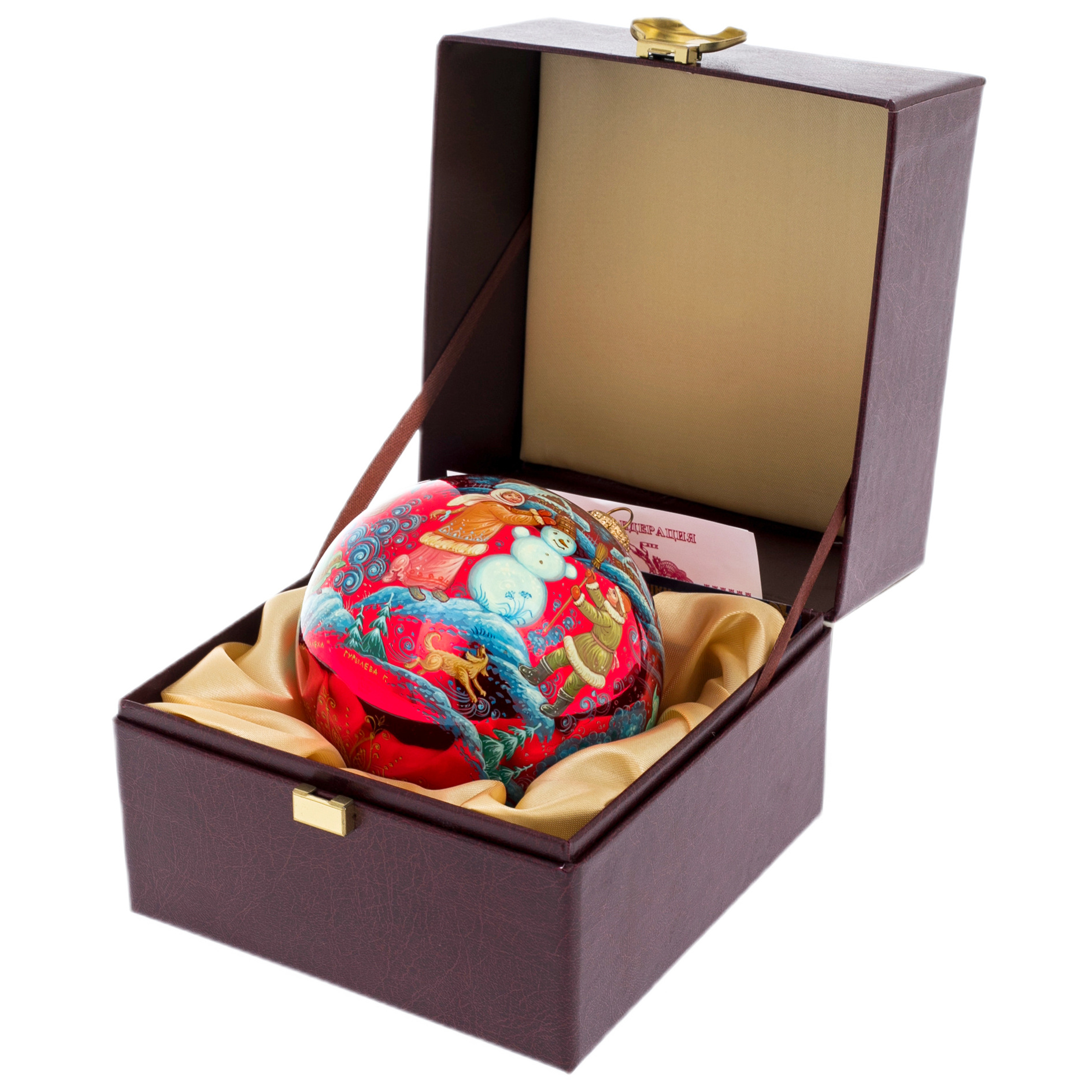 Этот елочный шар создан в традициях палехской миниатюры, прославившейся филигранной прорисовкой деталей и глубокой поэтичностью образов. Ручная роспись ложится на идеальную поверхность шара тонкими, почти ювелирными линиями, придавая ему характер художественного объекта, а не просто праздничного аксессуара. Каждая мазковая тень, каждая золотая нить орнамента вписывается в канон лаковой живописи, формируя впечатление драгоценной миниатюры, перенесенной на объемную сферу.