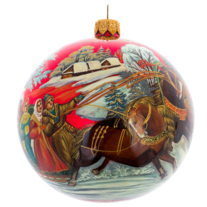 Этот елочный шар создан в традициях палехской миниатюры, прославившейся филигранной прорисовкой деталей и глубокой поэтичностью образов. Ручная роспись ложится на идеальную поверхность шара тонкими, почти ювелирными линиями, придавая ему характер художественного объекта, а не просто праздничного аксессуара. Каждая мазковая тень, каждая золотая нить орнамента вписывается в канон лаковой живописи, формируя впечатление драгоценной миниатюры, перенесенной на объемную сферу.