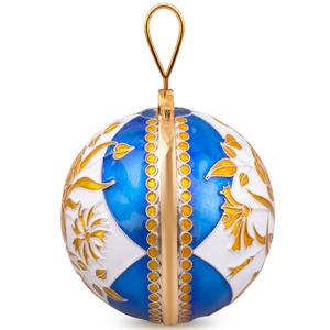 Орнамент нанесён в технике перегородчатой эмали, при которой каждый элемент композиции отделяется тончайшими металлическими нитями. Благодаря этой сложной технологии рождается эффект ювелирной тонкости и точности линий. Мельчайшие элементы декора буквально сияют в лучах света, создавая на поверхности игрушки игру бликов и тени. Такая техника требует высочайшего уровня ручной работы, что делает каждое изделие по-настоящему уникальным.
