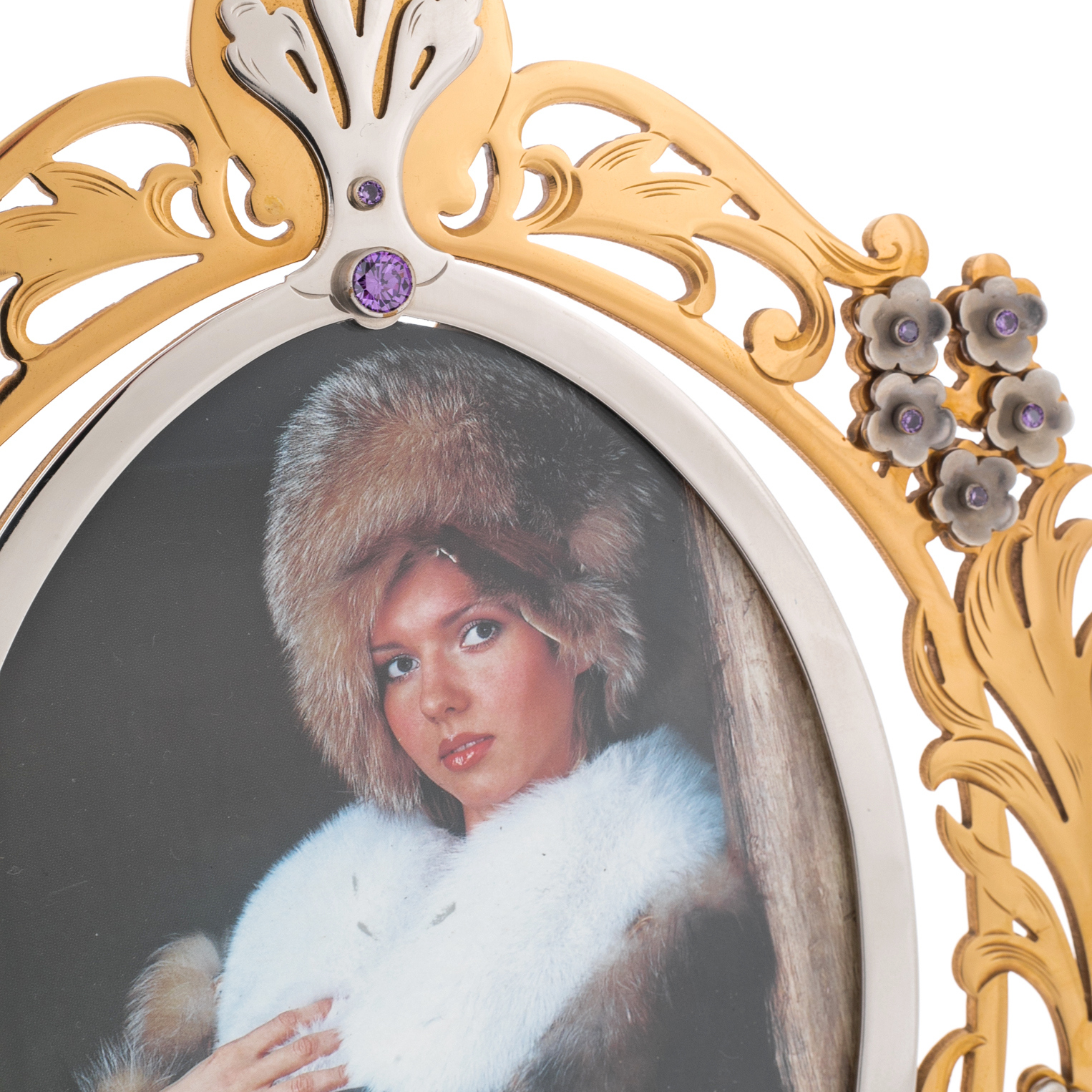 Эта рамка — не просто аксессуар, а ода изысканному вкусу. Её форма напоминает цветущий венок, обрамляющий фотографию, как природа обрамляет жизнь своими дарами. Завитки позолоченного металла, подобно лепесткам, создают впечатление живого движения, которое дополняют крошечные цветы, украшенные фианитами. Эти камни, искрящиеся фиолетовыми отблесками, добавляют ощущение утончённого шика и благородства.