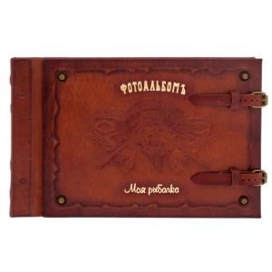 На двухуровневой обложке с ажурным тиснением по краям и латунными пуклями оттиснена с помощью "золотой" фольги пойманная трофейная рыба. Корешок альбома украшен тонированной деревянной планкой с "золотыми" гвоздиками. Альбом закрывается на кожаные ремешки.