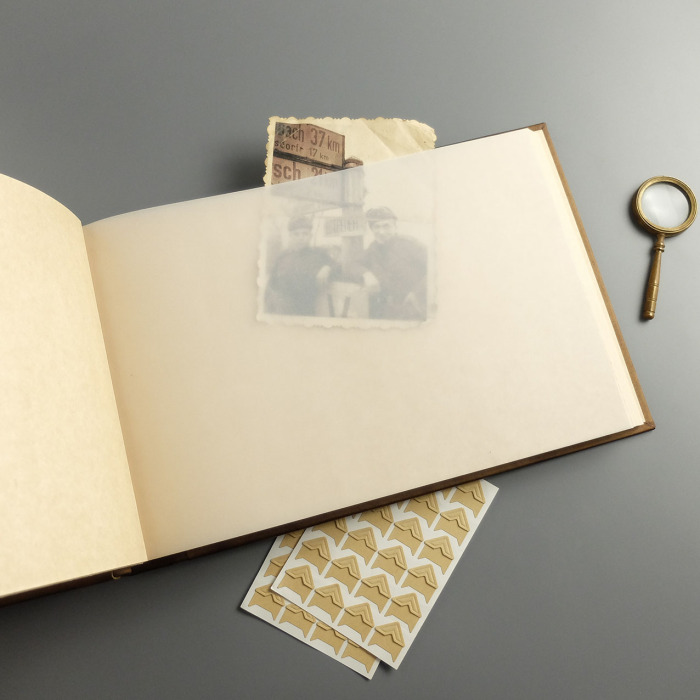 Кожа коньячного оттенка с лёгкой патиной, тиснение инициалов, 40 плотных страниц с шёлковой калькой — всё создано, чтобы хранить не кадры, а жизнь. Подписи на обороте фото, случайные заметки, даже пятно от вина — станут легендами семьи.