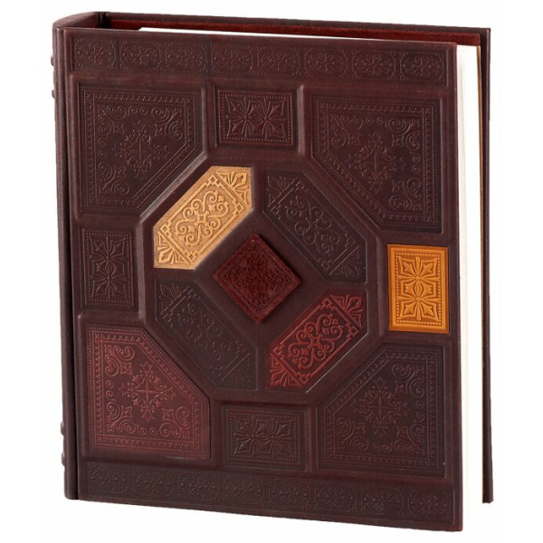 С помощью художественного тиснения на обложке из натуральной телячьей кожи, гарантируется долговечность этого изделия. Оформление выпуклой геометрической фактуры и чудесное ее оформление узорами и вензелями создают особый стиль альбома.