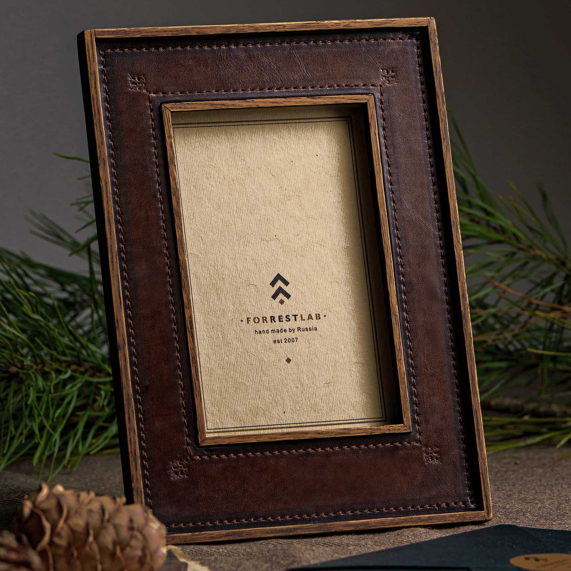 Кожаная фоторамка “Классик”, сочетает в себе великолепие мореного дуба и изысканность винтажной телячьей кожи, отполированной карнаубским воском до благородного сияния. Патина и антикварный вид придают ей особую роскошь и ощущение истории, что делает её идеальным дополнением для классического интерьера.