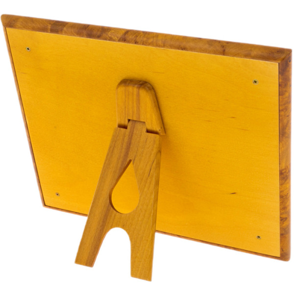 Рамка выполнена с идеальной геометрией и предельной точностью обработки каждого элемента. Гладкая полировка граней, изящная гравировка и тщательно подобранные пропорции демонстрируют высокий уровень исполнения. Деревянное основание добавляет вес и стабильность, делая изделие не только эстетически совершенным, но и надёжным в повседневном использовании. Подставка с плавным завитком на оборотной стороне подчеркивает декоративную изощрённость и дополняет общий образ предмета.