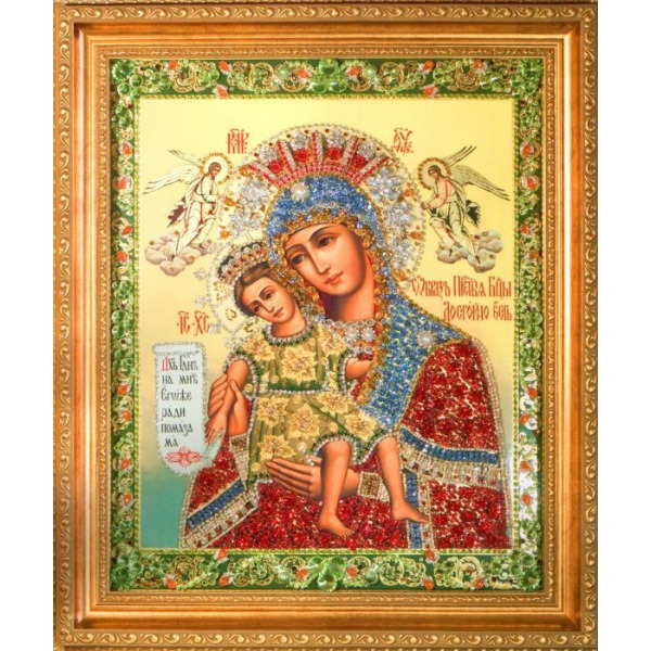 Икона с драгоценными камнями "Владимирская Богоматерь"Икона с драгоценными камнями "Владимирская Богоматерь"Владимирская икона Божией Матери относится к иконографическому типу «Умиление», где показана вся полнота любви между Богом и человеком.