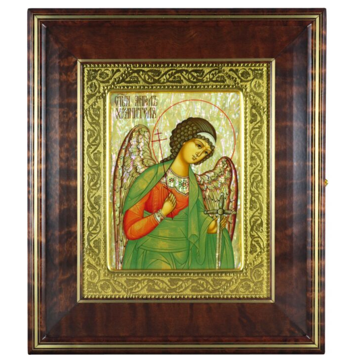 Икона "Ангел Хранитель" в киоте и золотой раме на натуральном перламутре