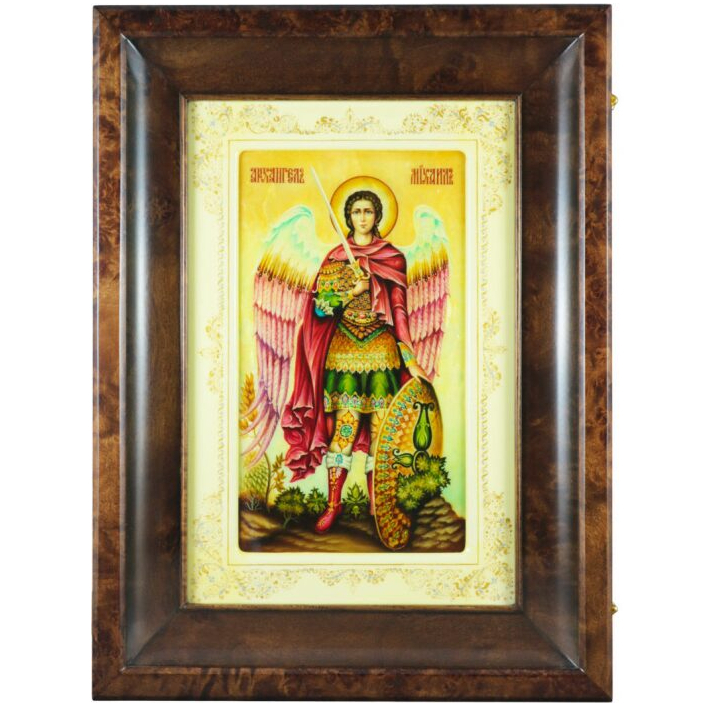 Икона "Архангел Михаил" на натуральном перламутре в киоте и белой раме