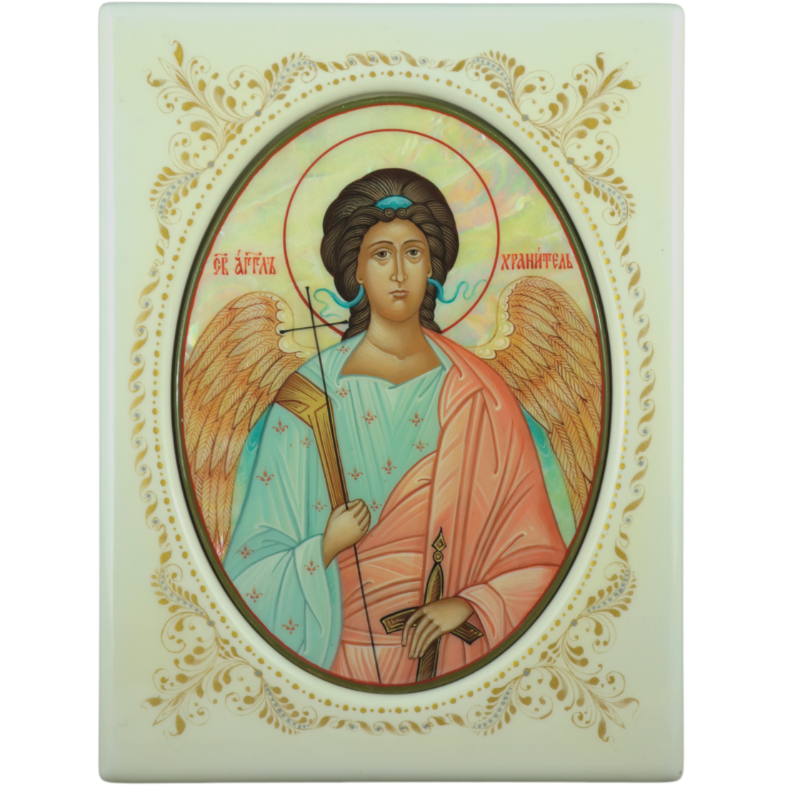 Икона на натуральном перламутре "Ангел Хранитель" с сусальным золотом