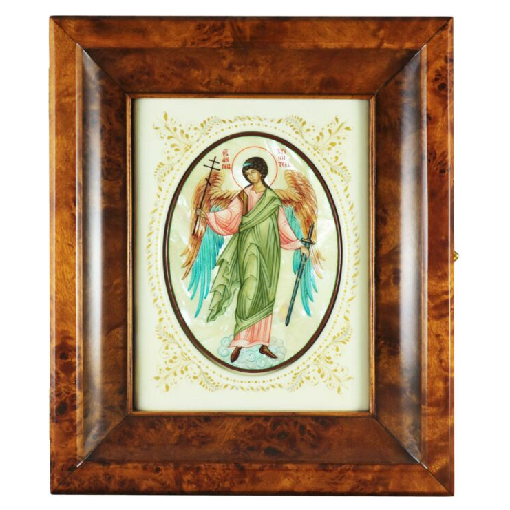 Икона на натуральном перламутре "Ангел Хранитель" в белой раме и киоте